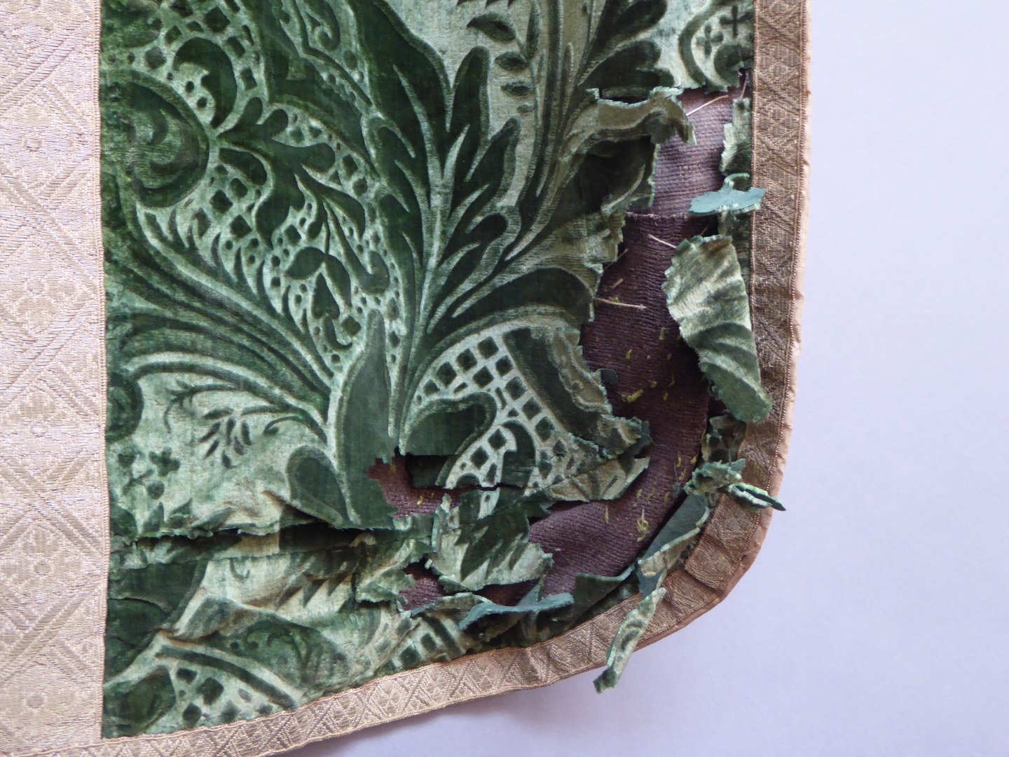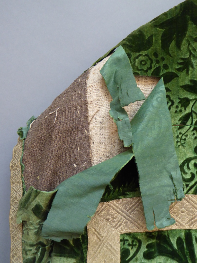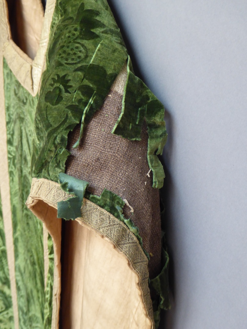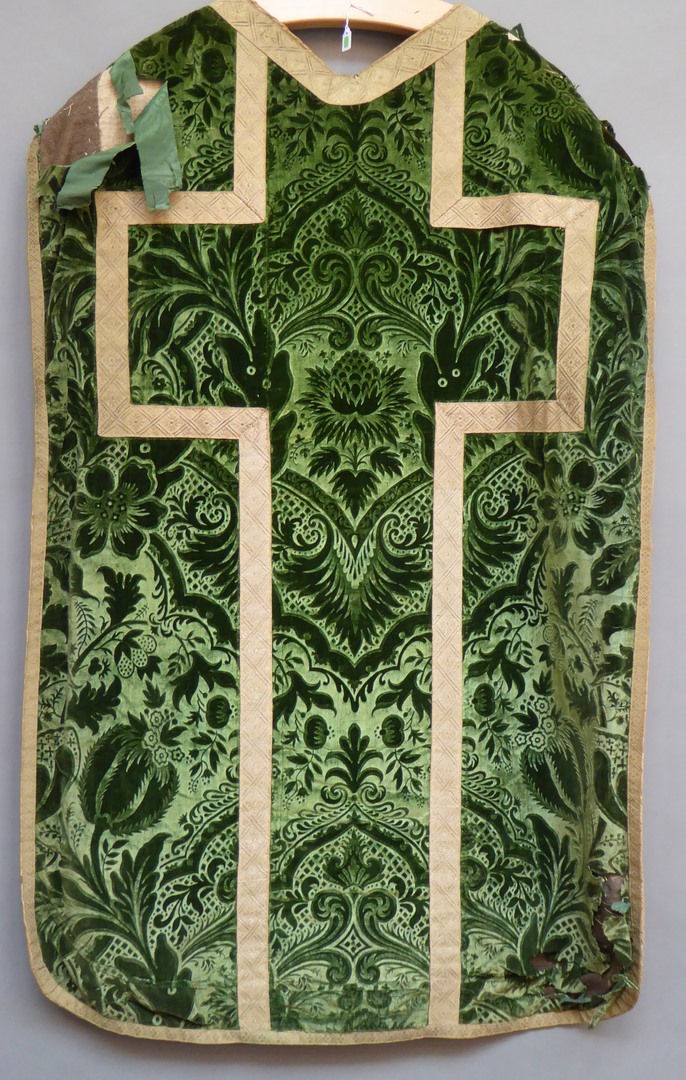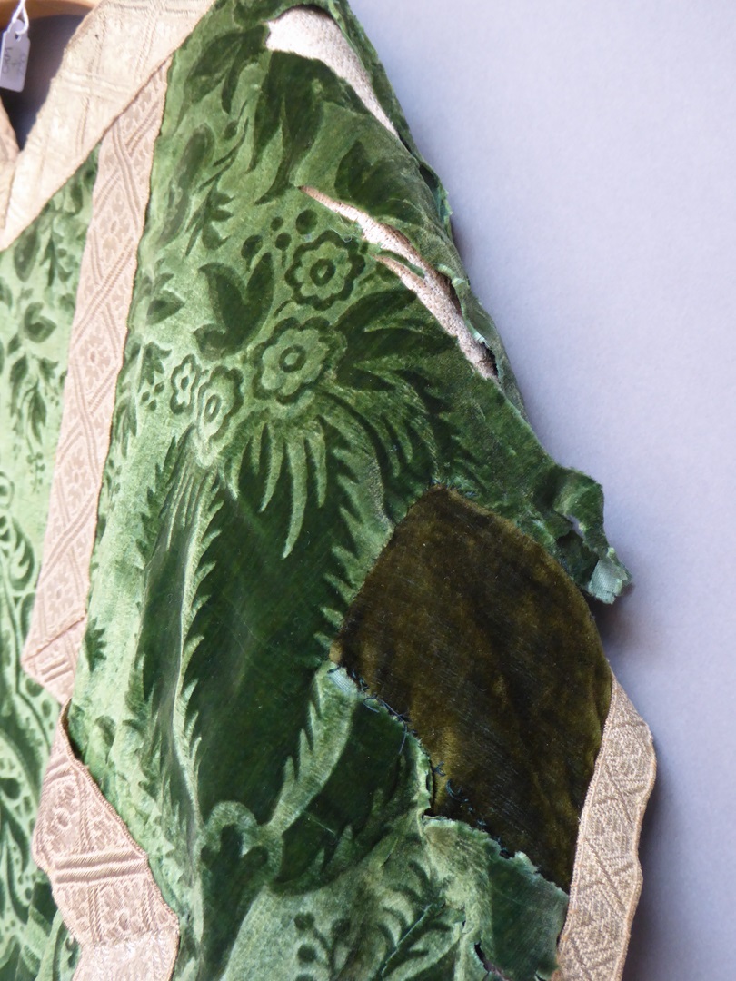 Groen kazuifel van reliëffluweel met bloemmotieven