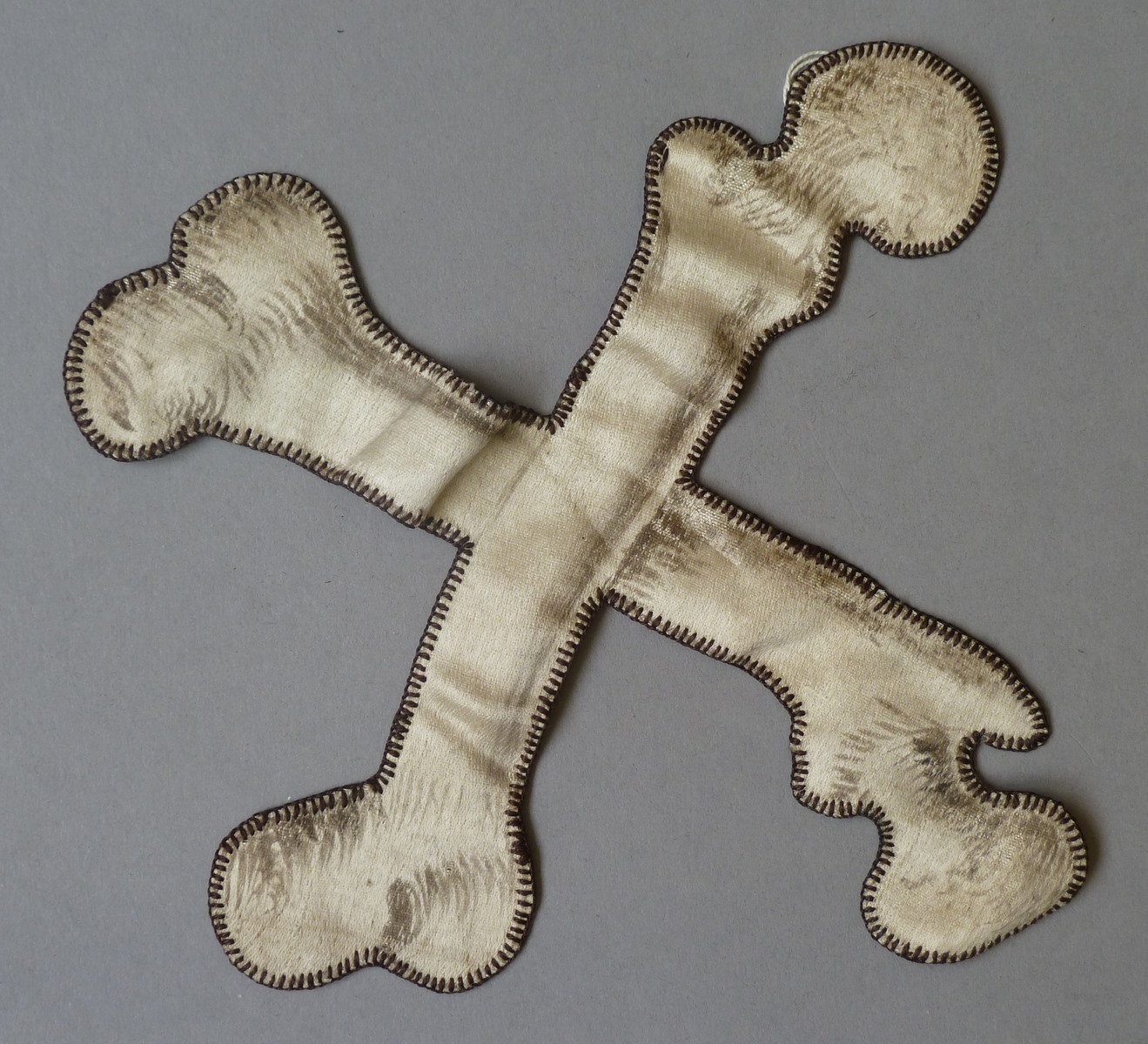 Wit satijn waarop met zwarte inkt gekruiste botten getekend zijn, van rouwkazuifel(?)