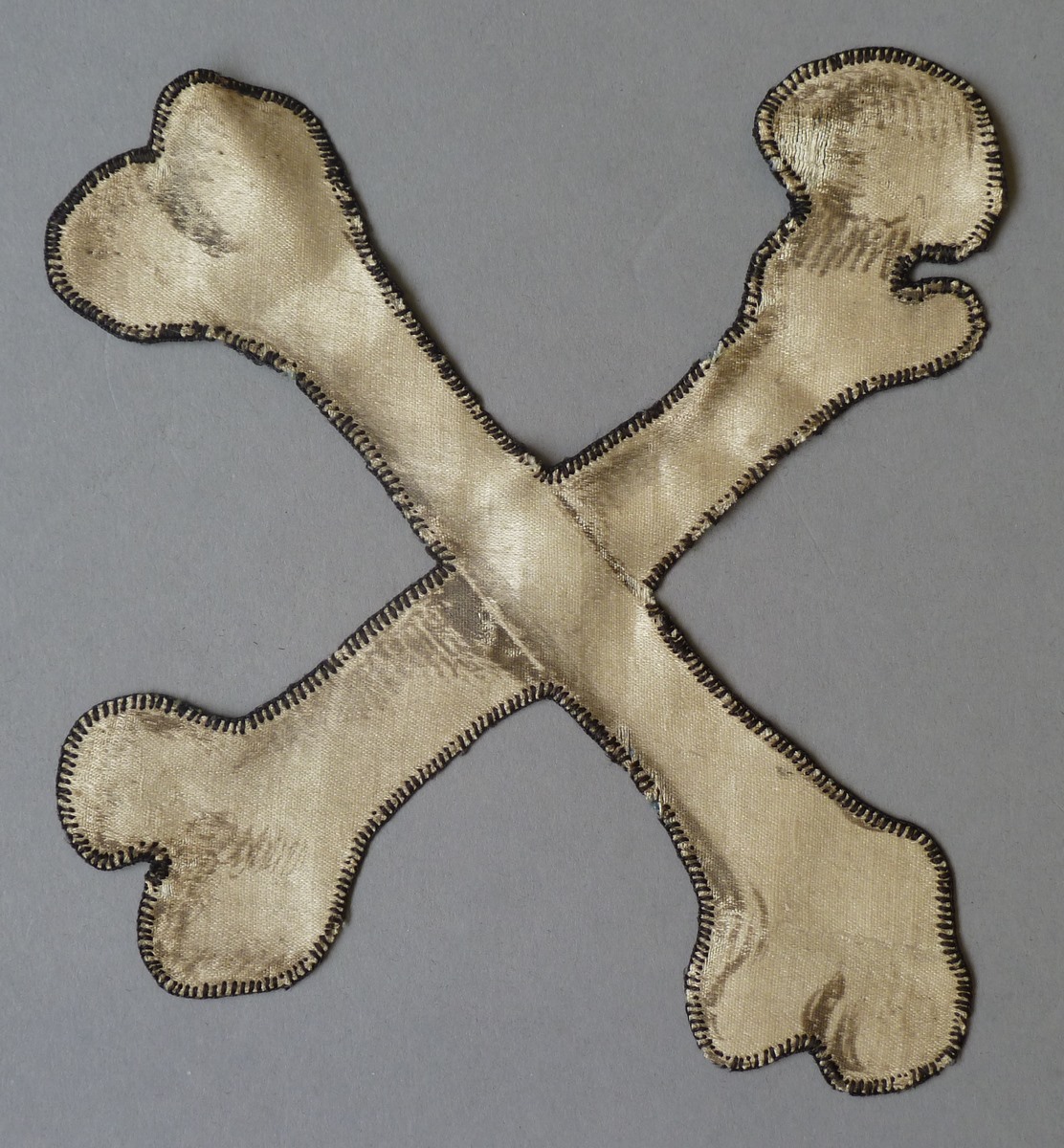 Wit satijn waarop met zwarte inkt gekruiste botten getekend zijn, van rouwkazuifel(?)