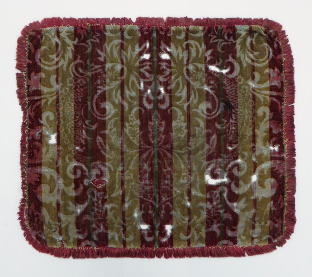 Voorzijde van olijfgroen met rood gestreept kussen met geschoren granaatappelmotief