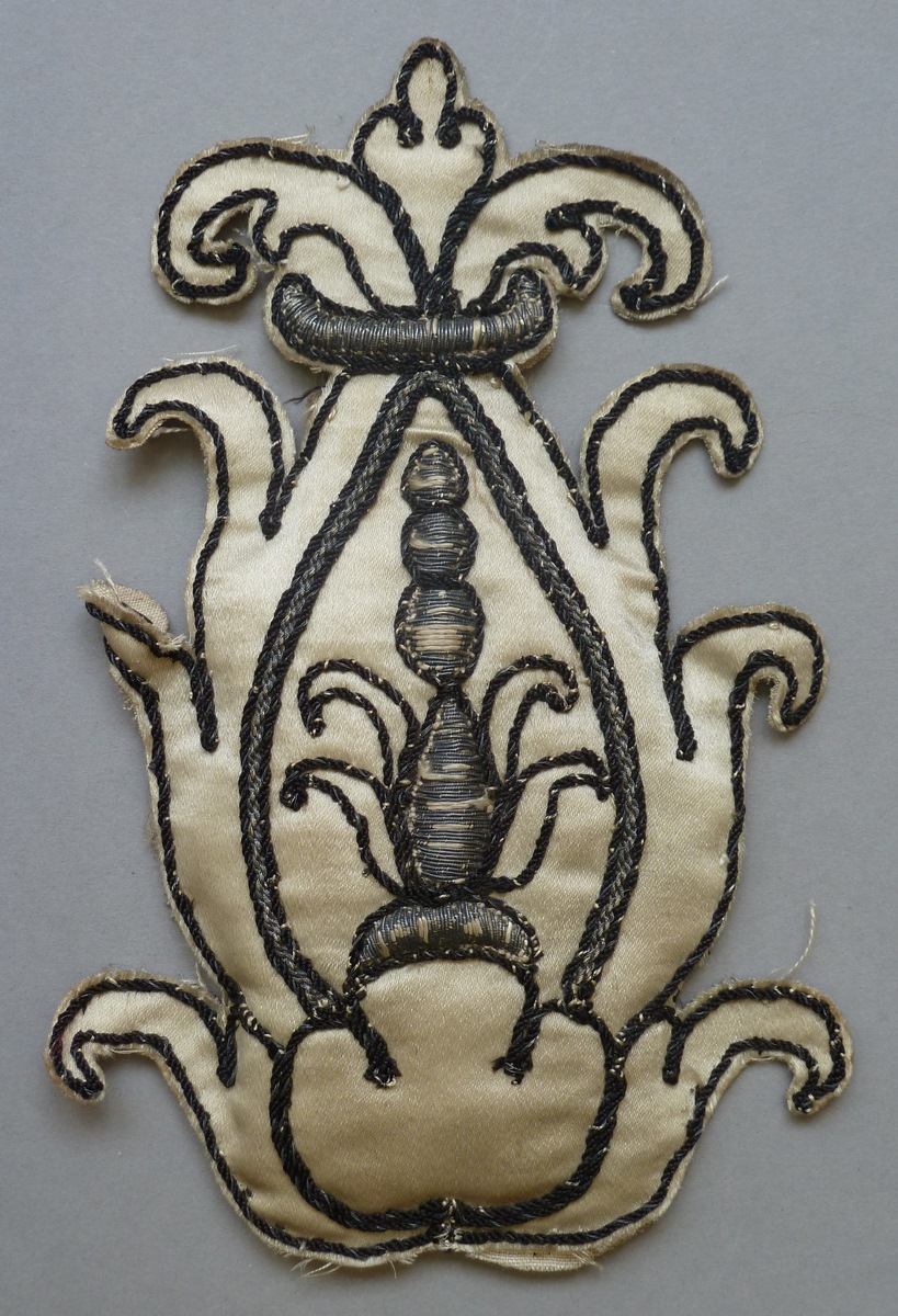 Wit ornamentje voor kazuifel in neogotische vormen, afgezet met zwart koord