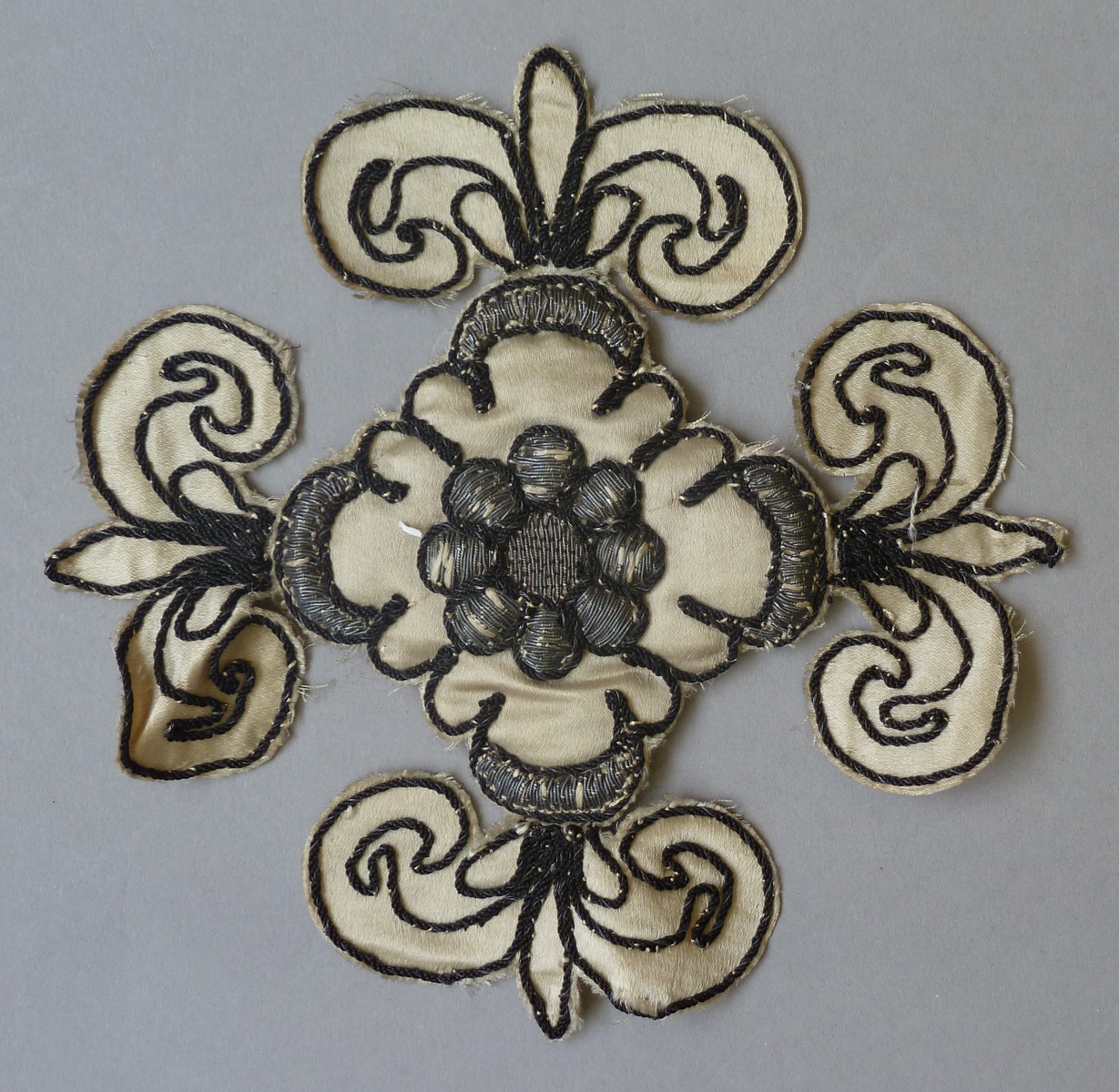Wit ornamentje voor kazuifel in neogotische vormen, afgezet met zwart koord