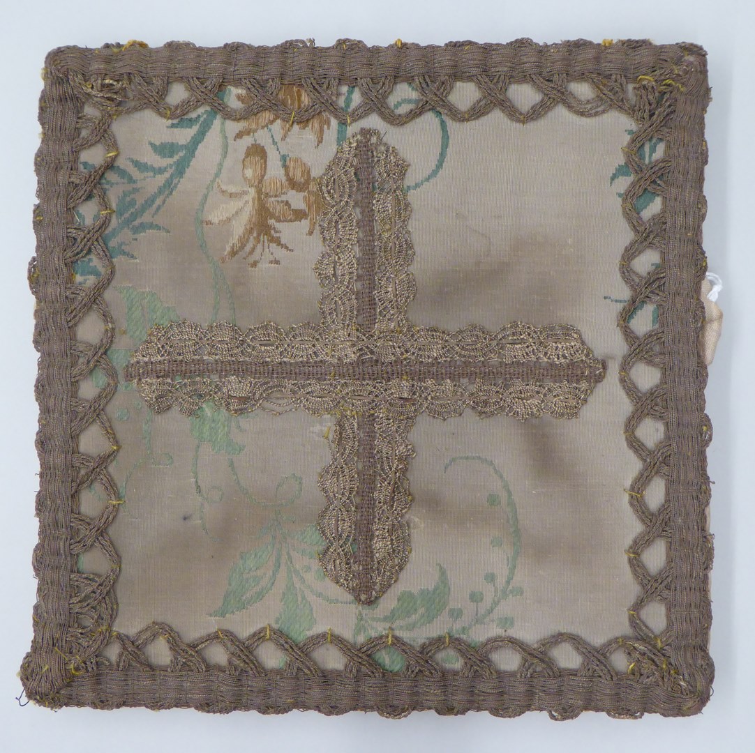 Witte beurs met ingeweven plant- en bloemmotief, kruis en rand van goudkant