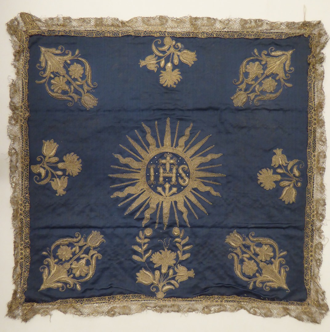 Blauw kelkvelum met IHS in stralenkrans en bloemen