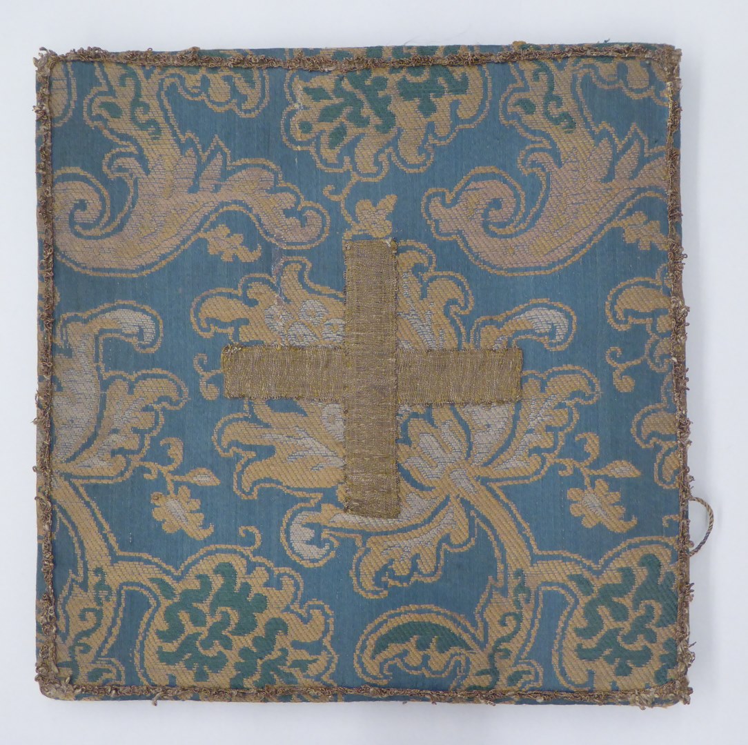 Blauwe beurs met ingeweven bloempatroon, gouddraad kruis en rand van goudgalon
