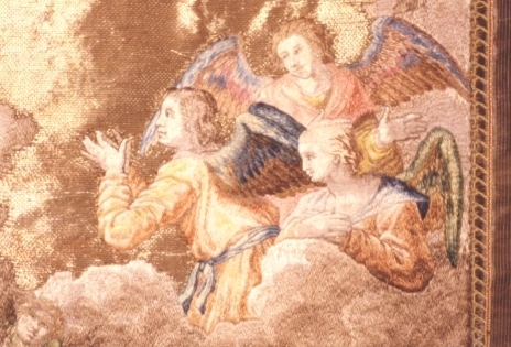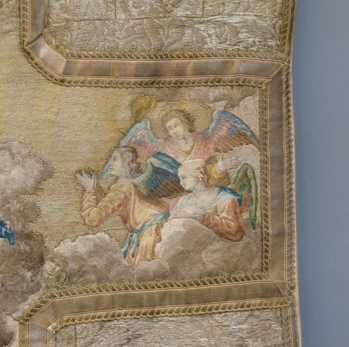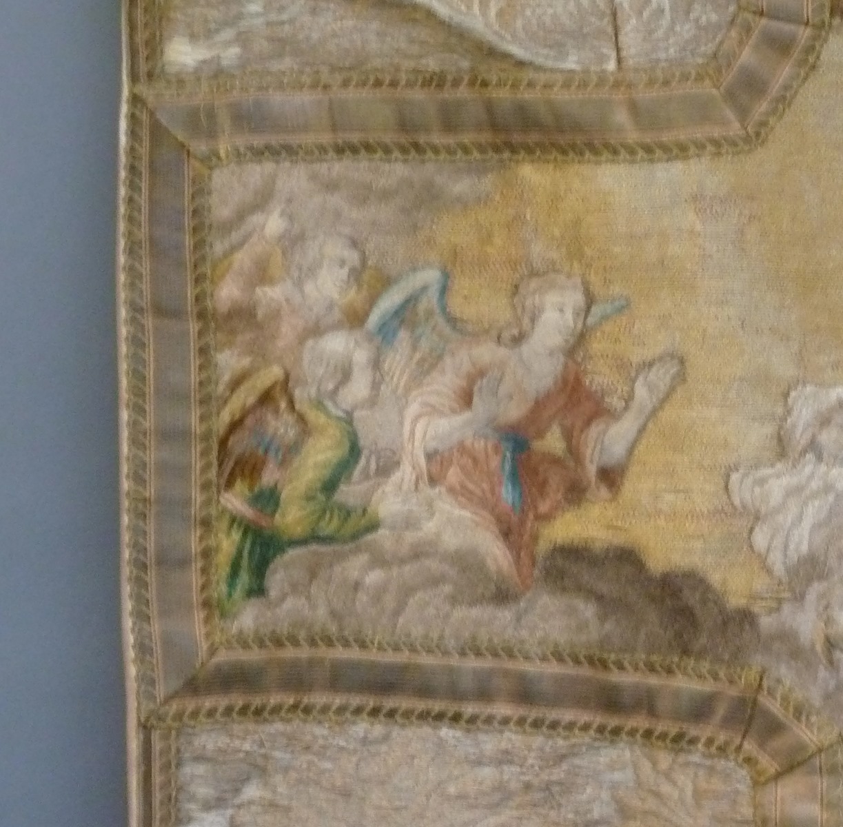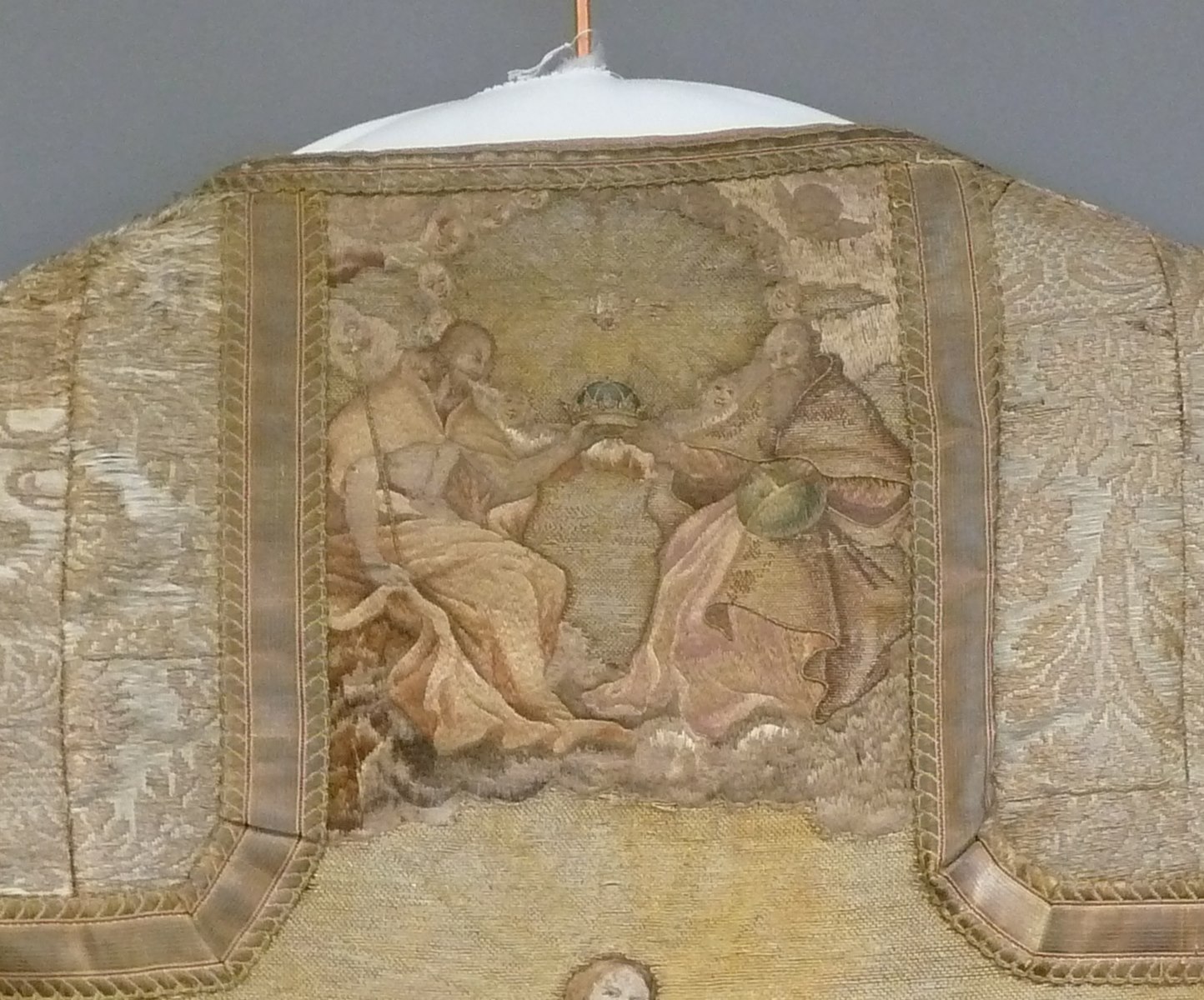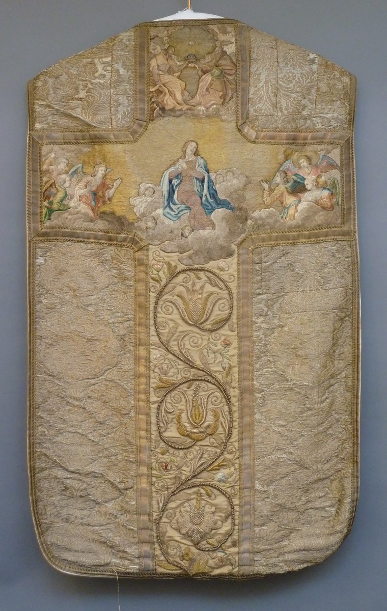 Wit kazuifel met ingeweven granaatappelmotief met Maria hemelvaart