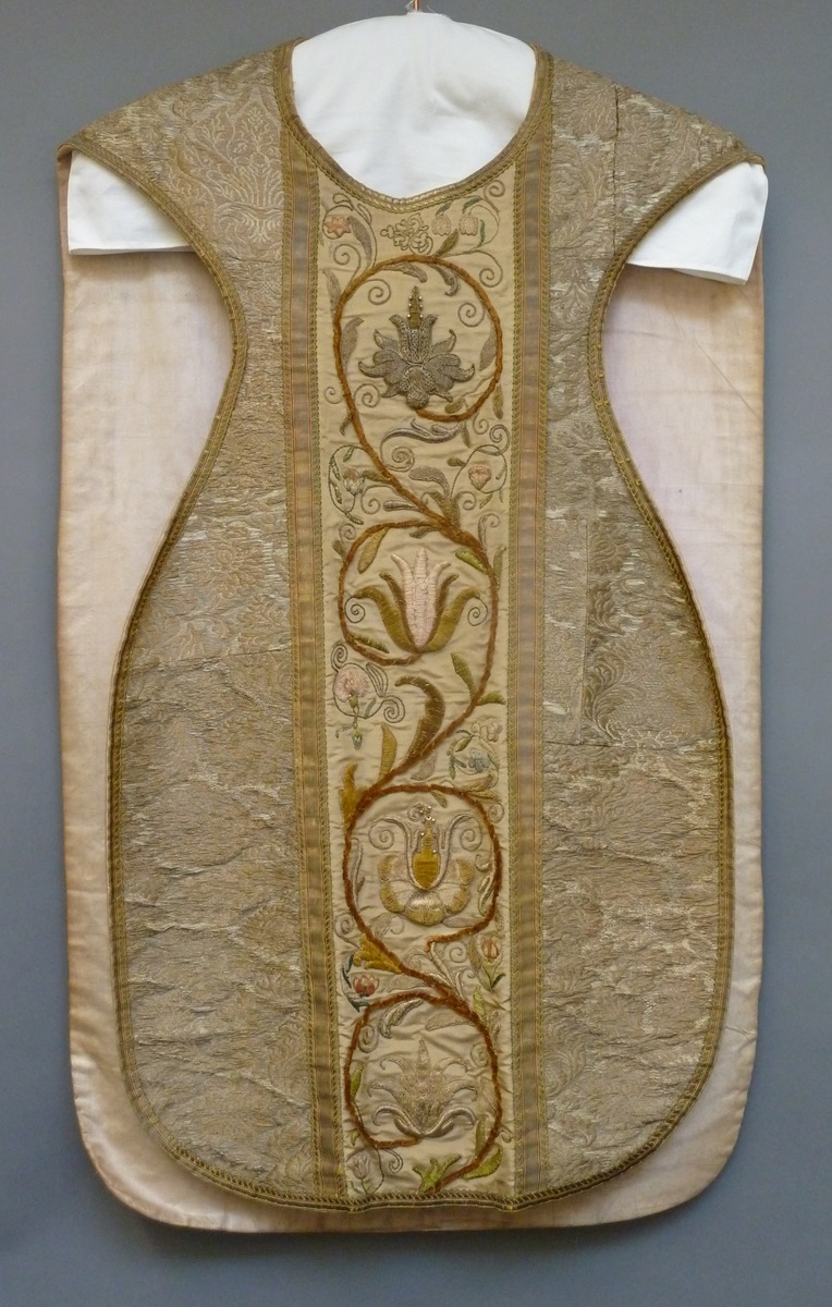Het kazuifel heeft een vioolvorm. De kolom aan de voorkant heeft een beige ondergrond van geribde zijde, versierd met gestyleerde ranken, gedeeltelijk van opgehoogd gelegd gouddraad en pareltjes, gedeeltelijk vervangen door een bruin fluwelen band. De achterkant van het kazuifel is op dezelfde manier versierd, maar in betere staat. Het bovenste gedeelte van het kazuifelkruis ...