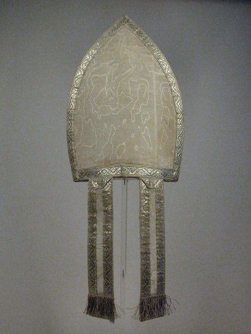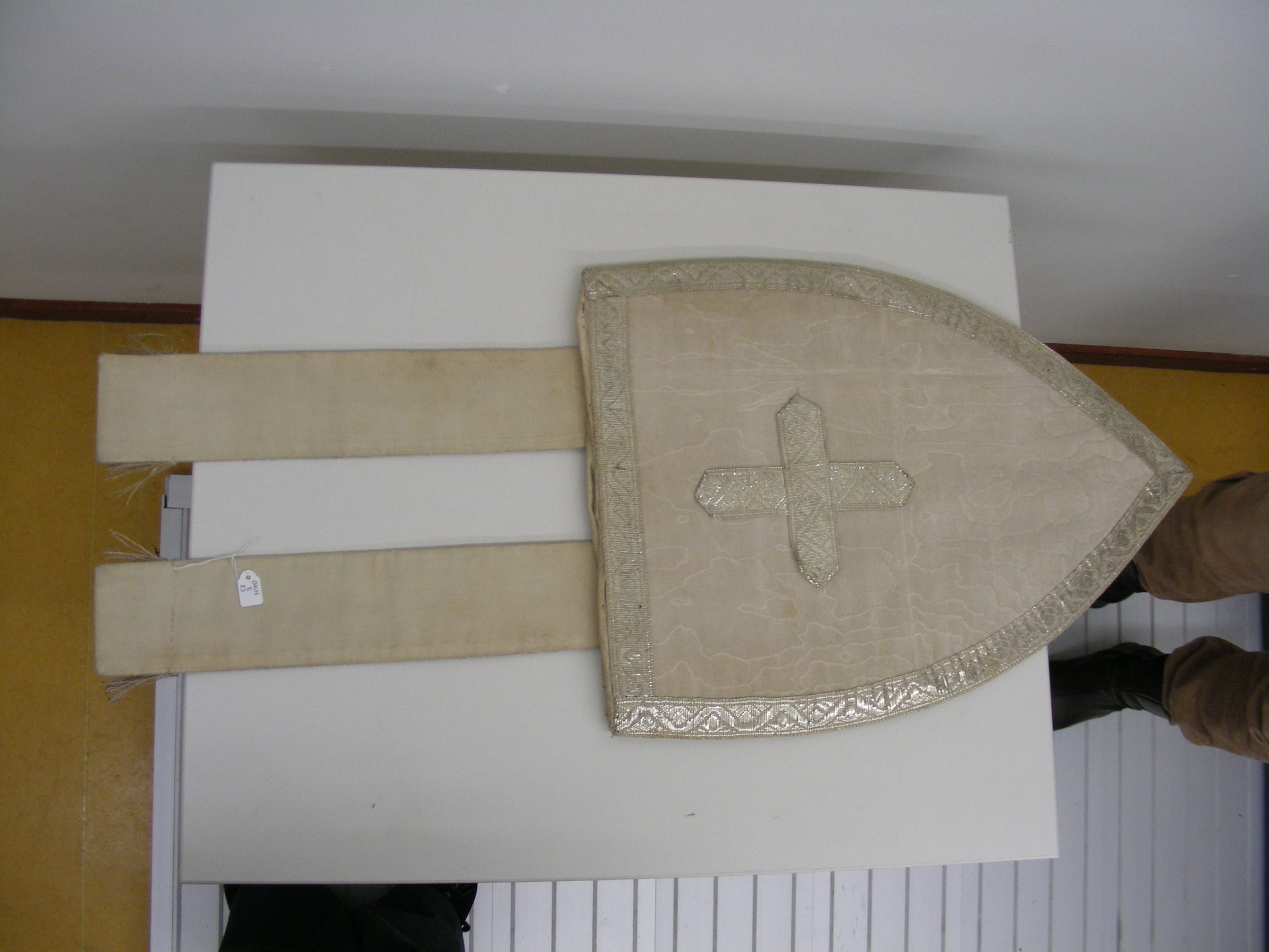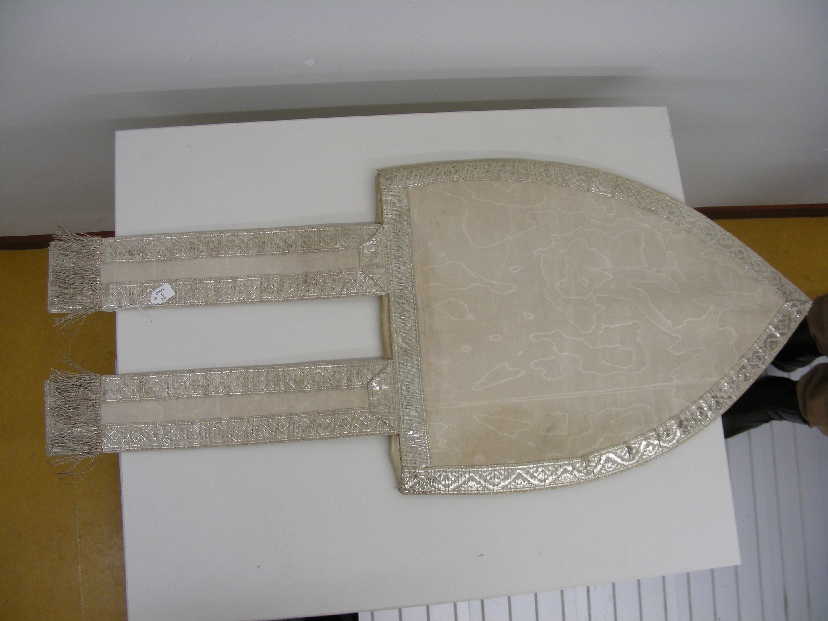 Witte (crème) mijter afgezet met machinaal zilvergalon