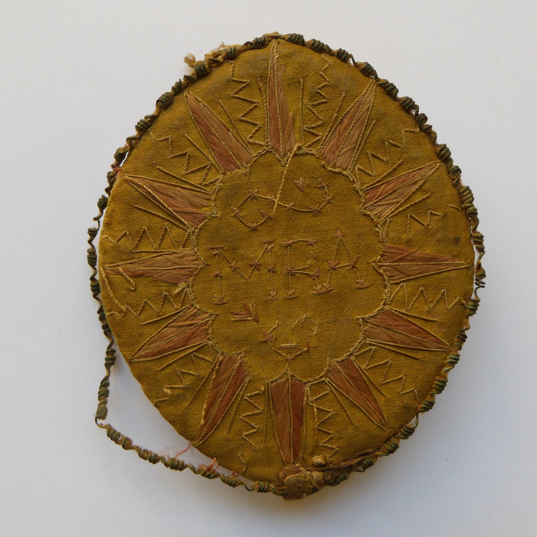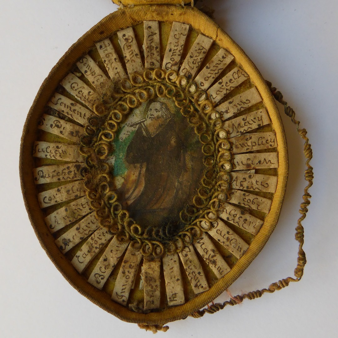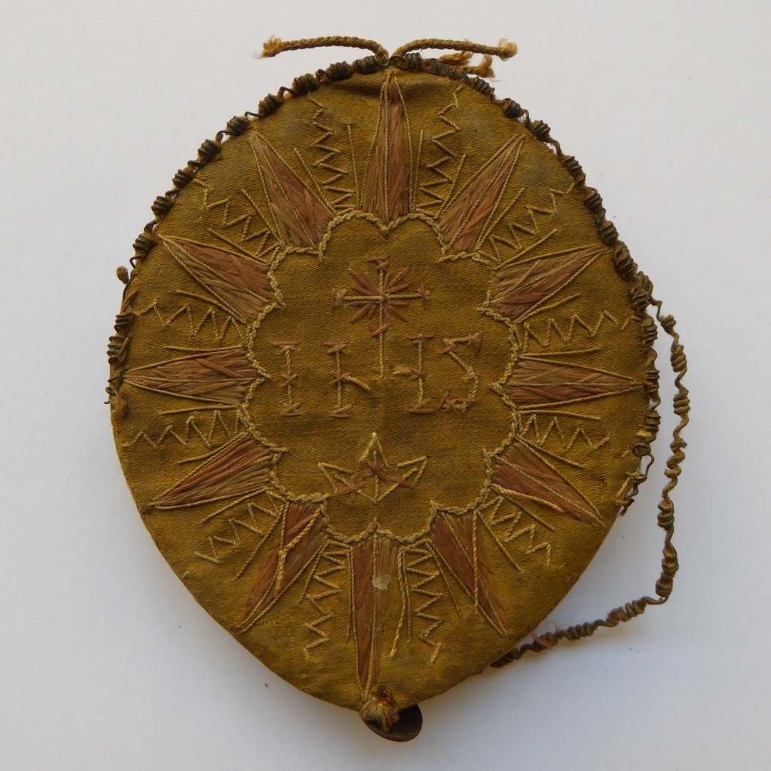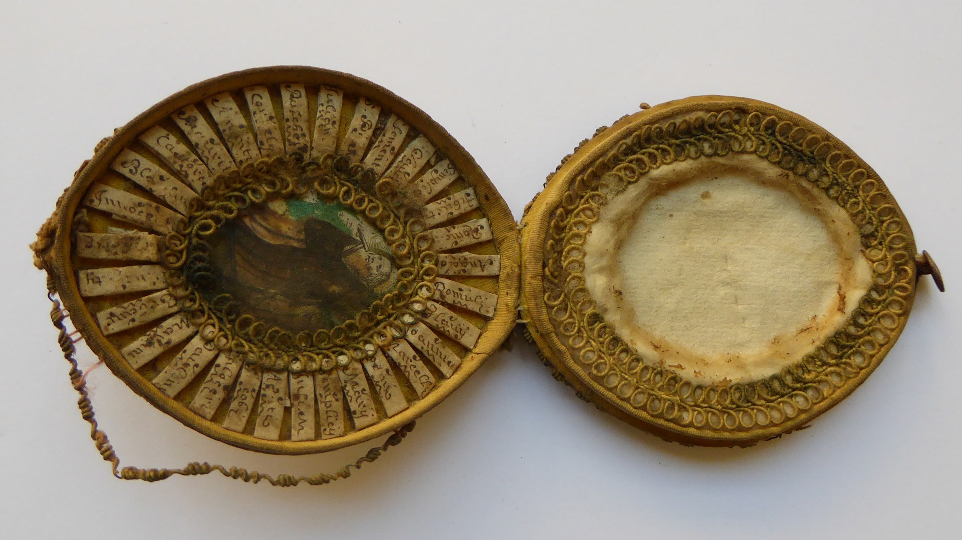 Ovalen reliekdoosje met "IHS" waarin ingekleurd prentje, waaromheen krans van relieken