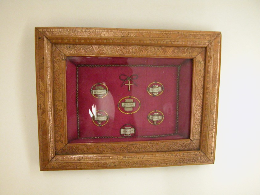 Reliekschilderij met ingelegde houten lijst met zes relieken van o.a. geestelijken van Port-Royal