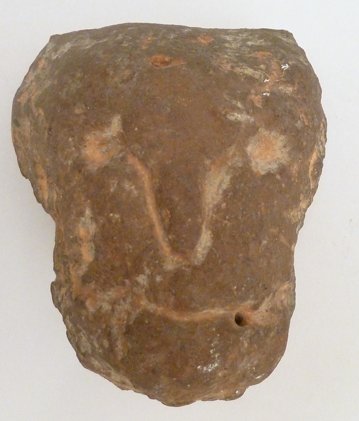 Het kopje is van boven breed, springt dan wat smaller in en heeft een ronde kin. Een ingekraste lijn geeft de neus aan. Dit lijntje is aan weerszijden verbonden met een gaatje voor de ogen. Ook de mond is een ingekraste lijn. Bovenop gedateerd "1436". De vier heeft echter een haakvorm, die meer overeenkomt met ...
