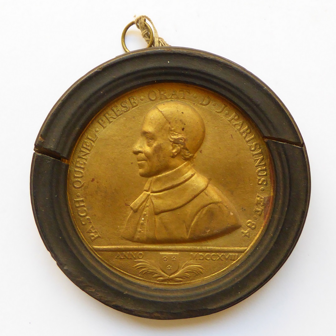 Medaillon met "Pasch. Quesnel. Presb. Orat. d. I. Parisinus E.T. 34" en "MDCCXVII"