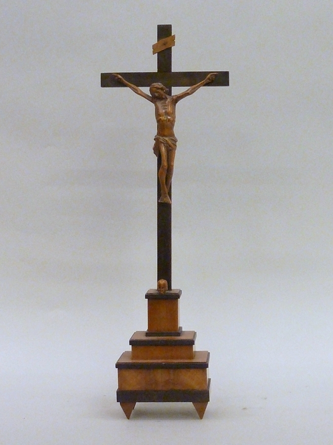 Crucifix op trapsgewijs gevormde voet, met corpus van mahoniehout