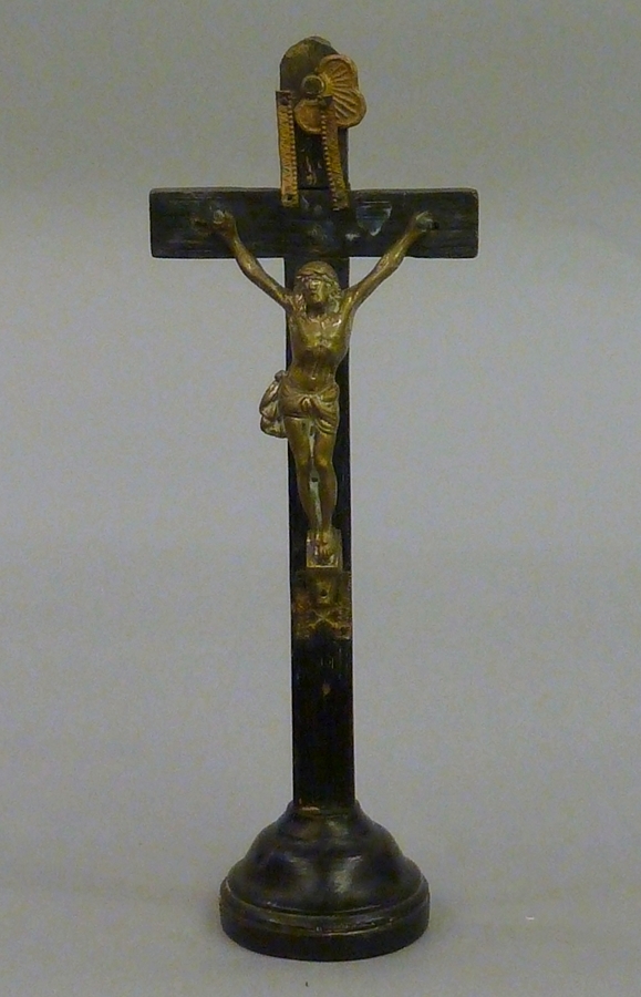 Crucifix met koperen corpus en koperen applique met Adamsschedel en botten