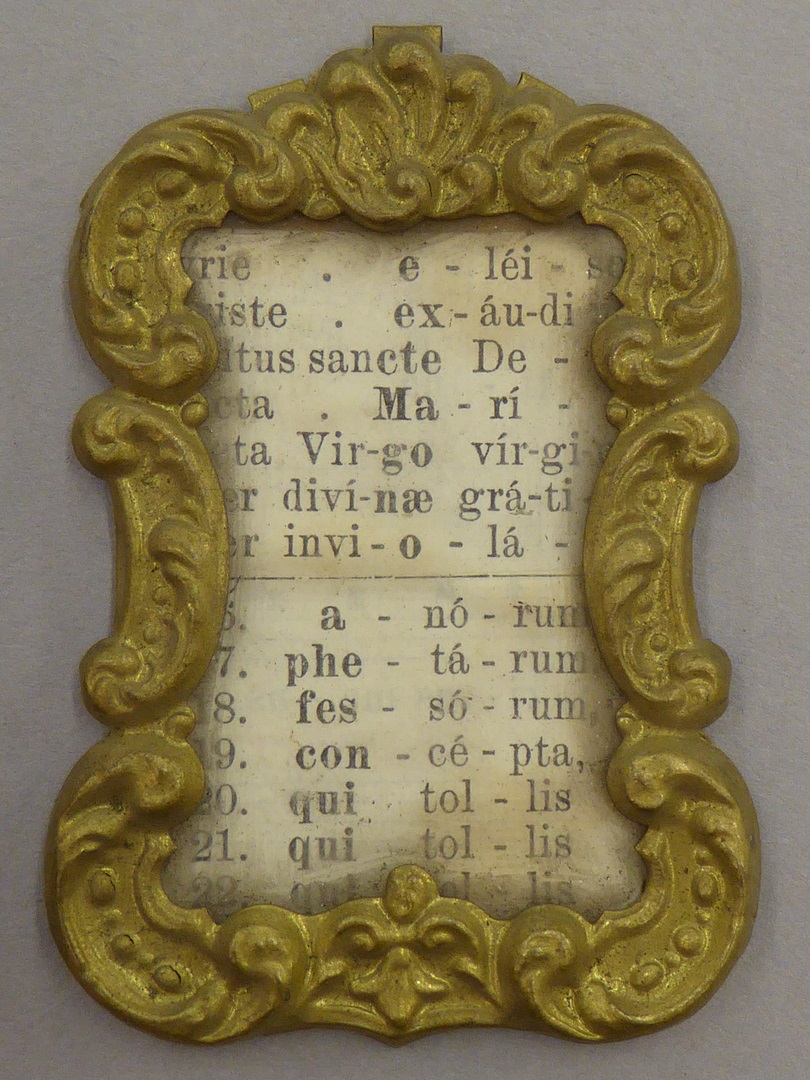 Speelgoedcanonbord met koperen lijst, met achter glas stukjes mistekst