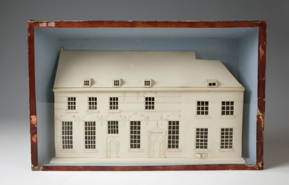 Model van gevel van 't Huis te Poort te Schiedam, achter glas. Op de achterzijde een etiket met 'Jac. de Ronde', wellicht de maker van het model.