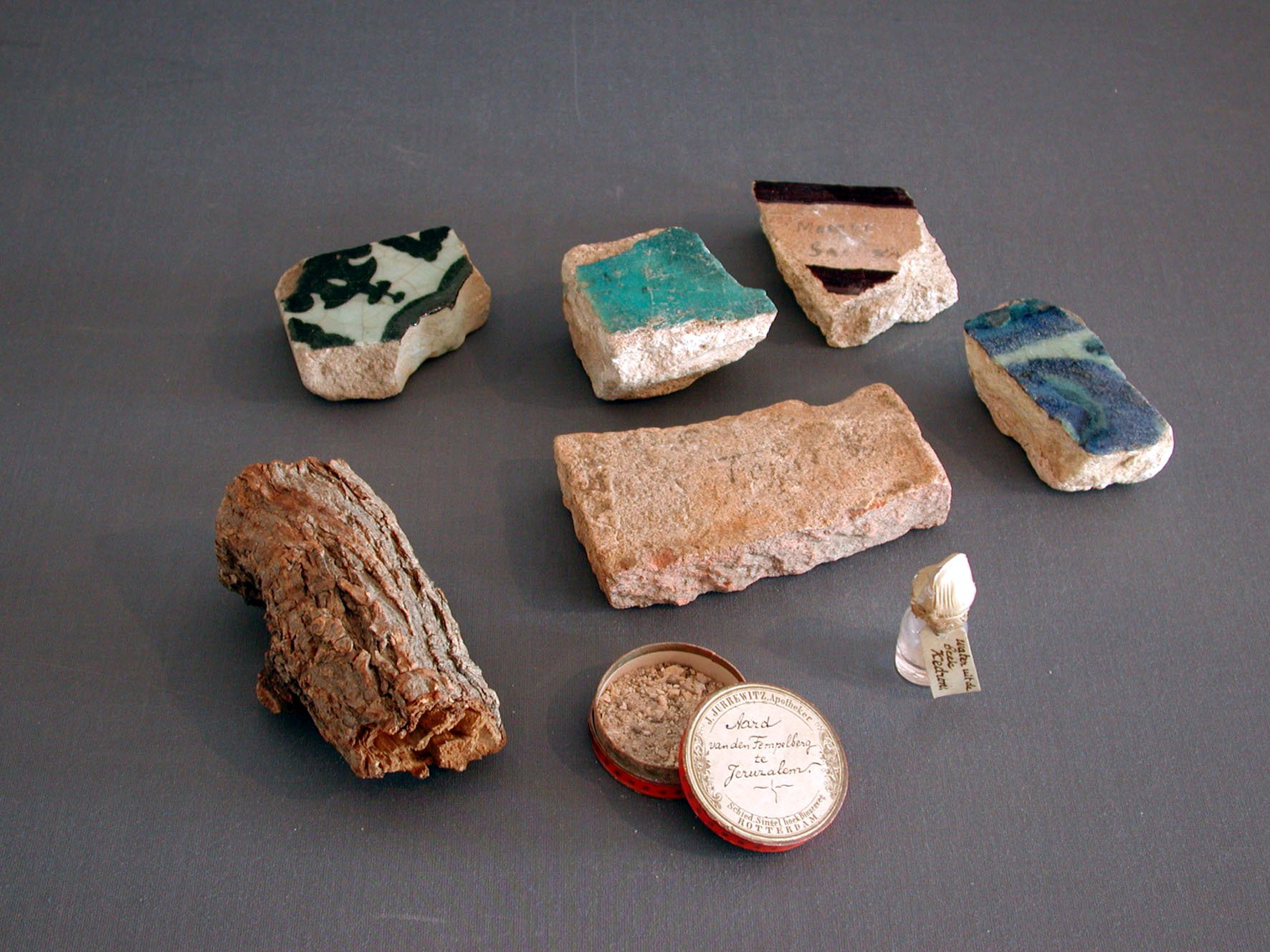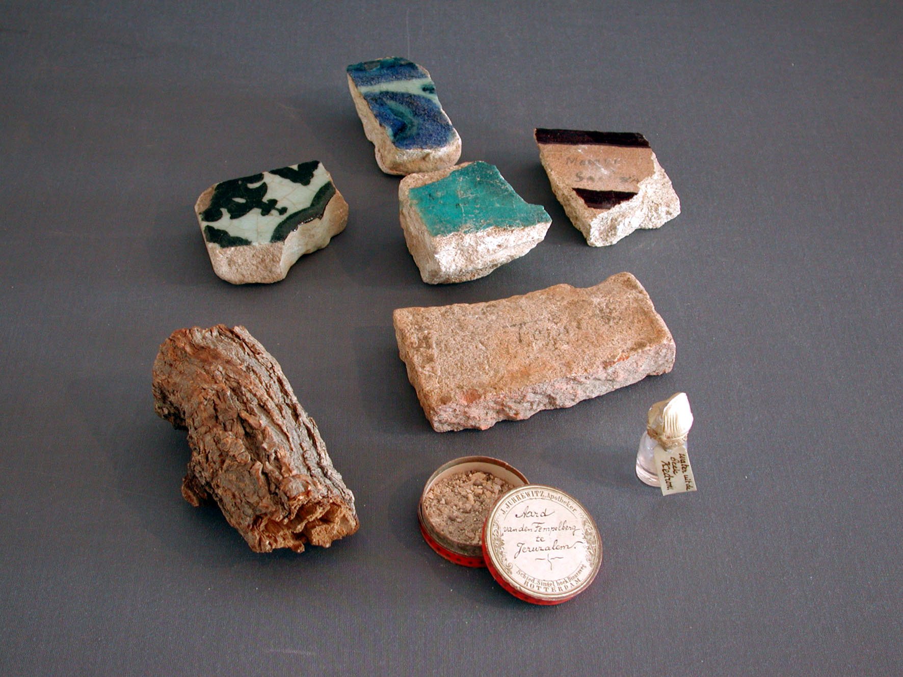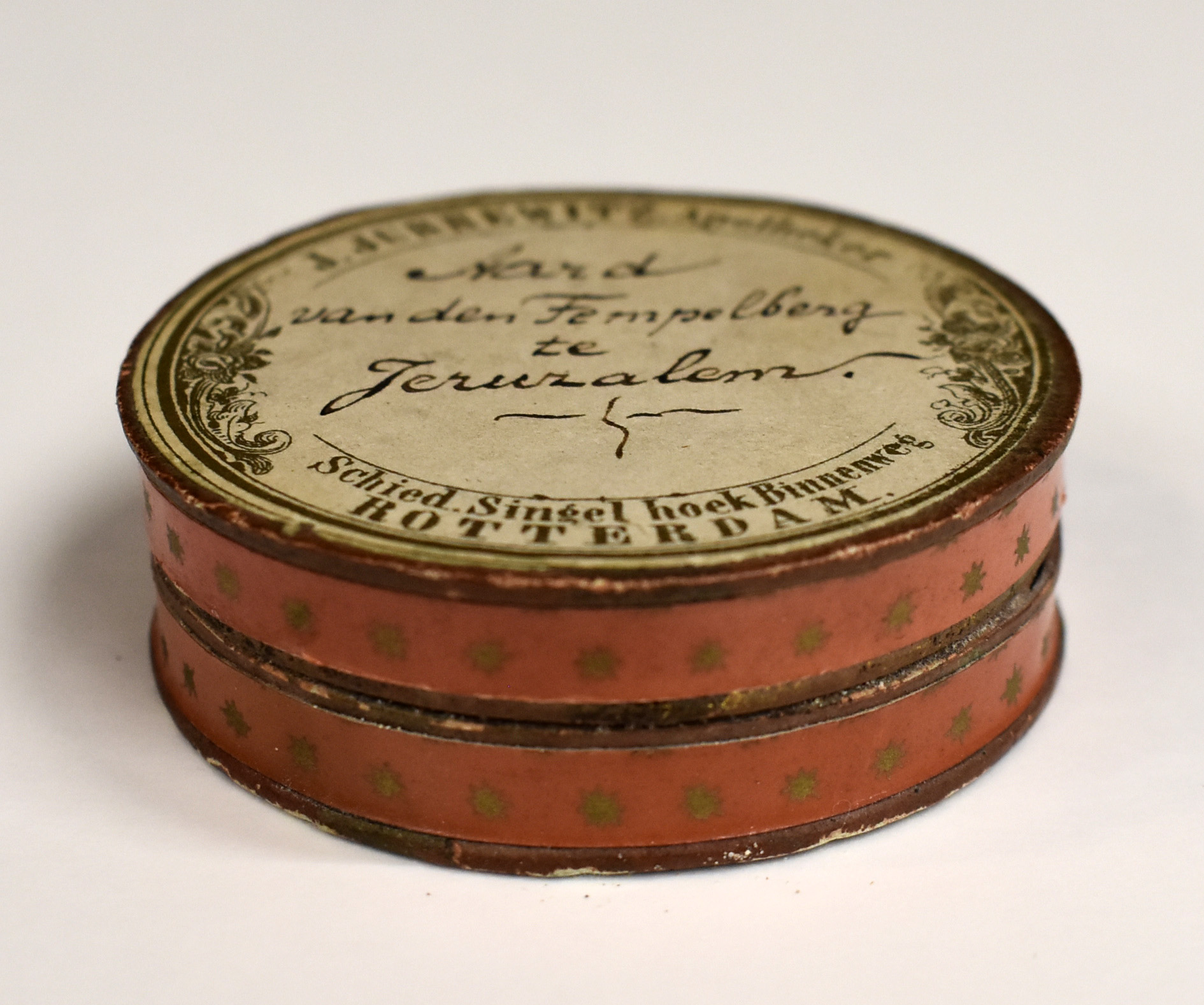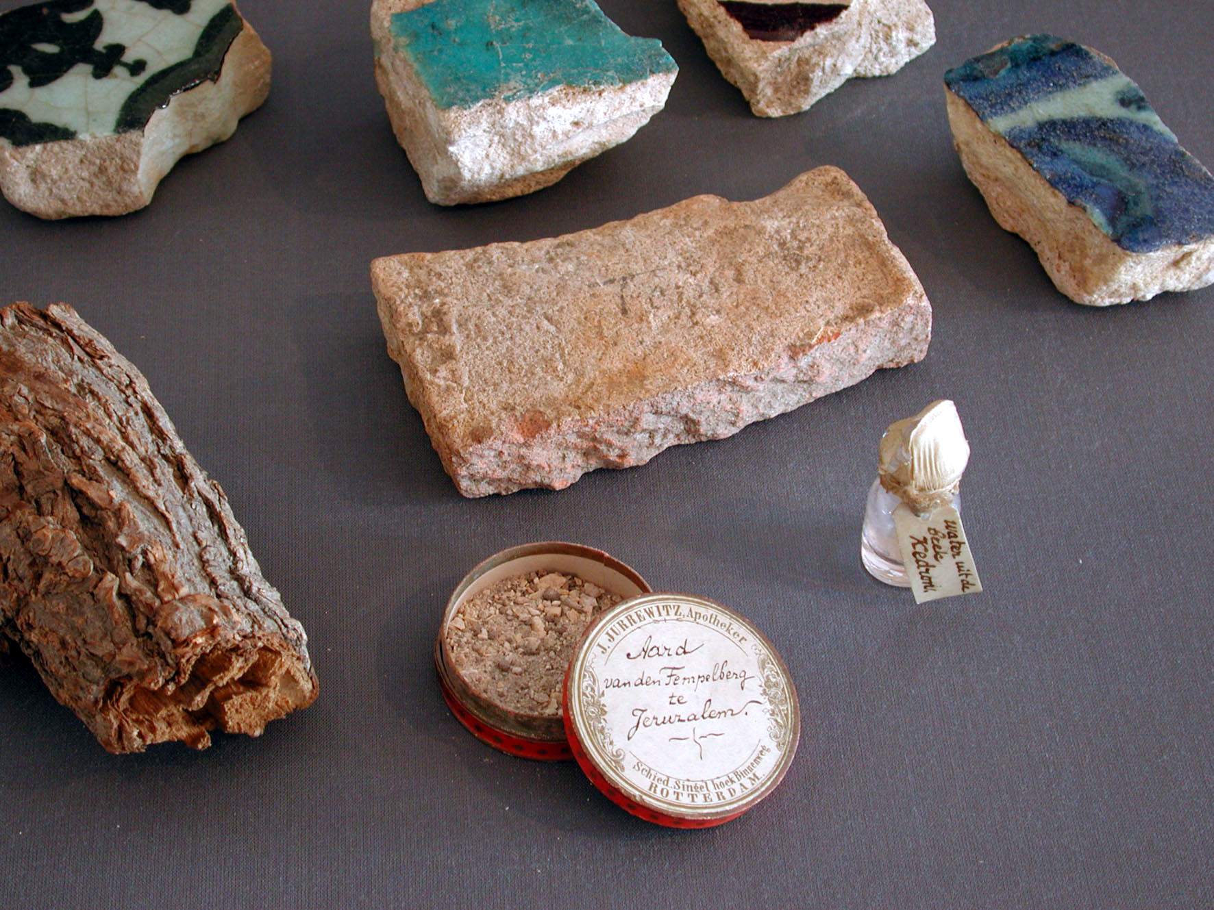 Pillendoosje gevuld met aarde "... van den Tempelberg te Jeruzalem"