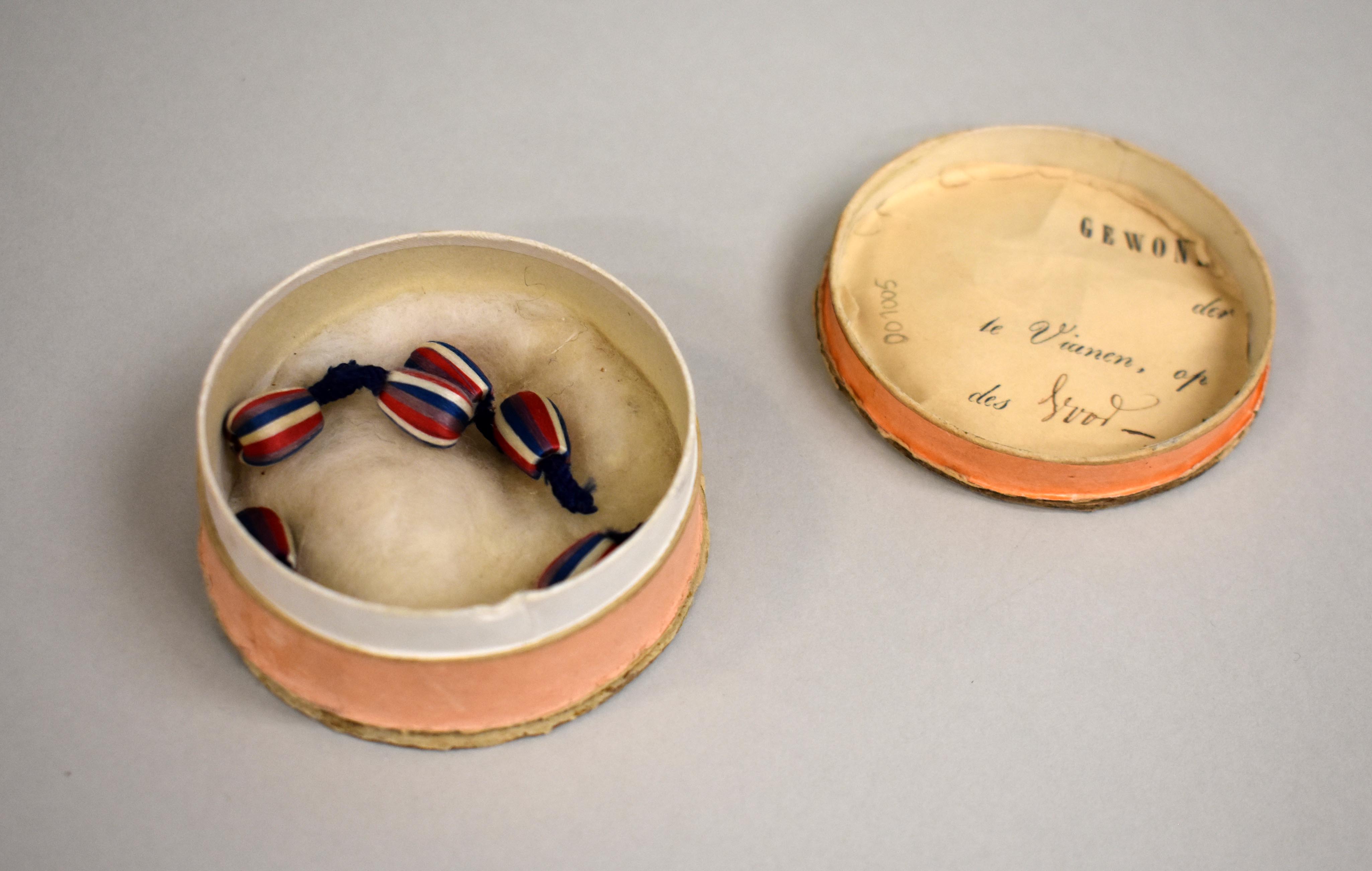 Pillendoosje met zes textielen granaatappeltjes van de mantel van de figuur van de hogepriester