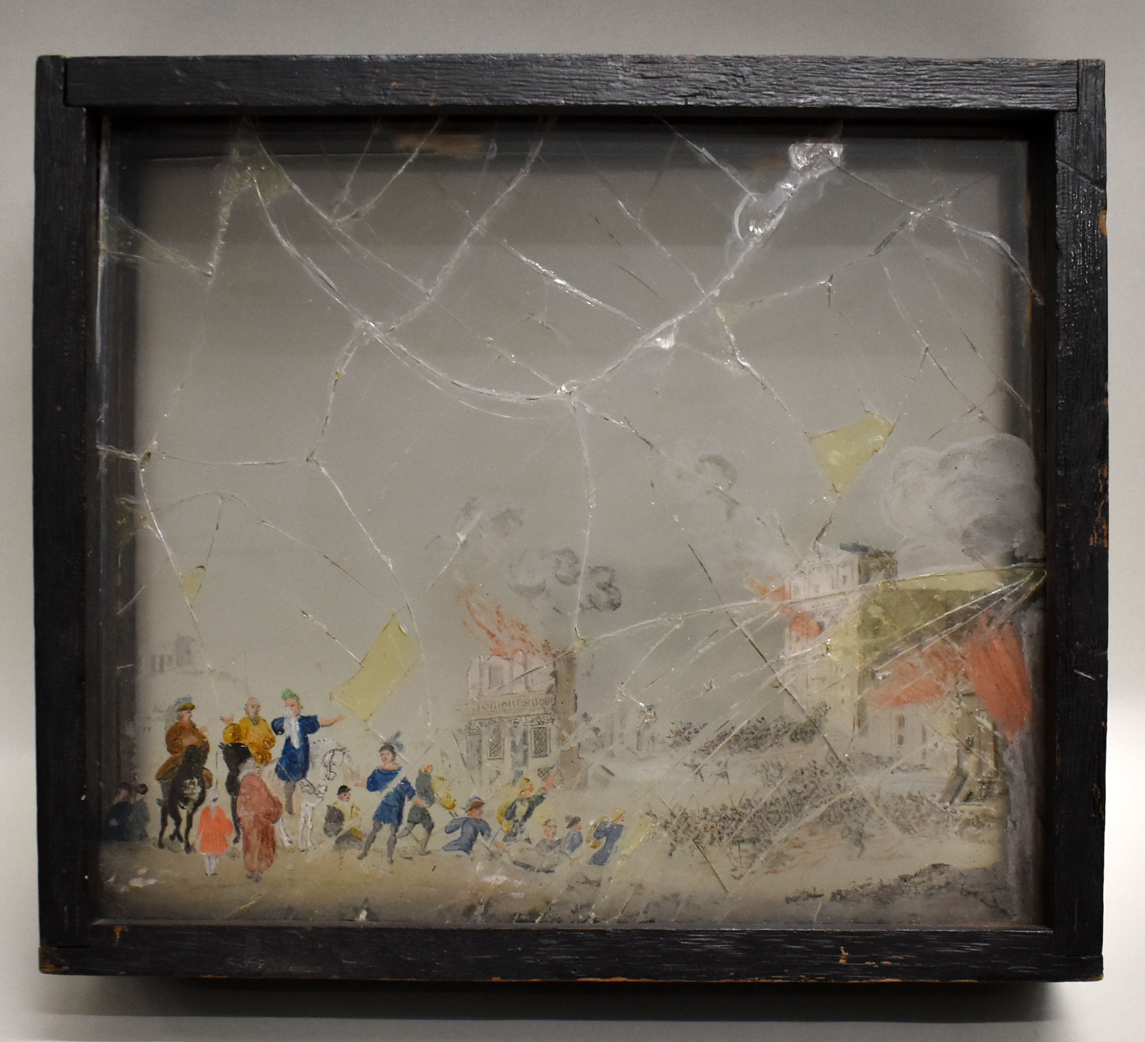 Perspectiefkast met de verbranding van de tempel te Jeruzalem. Op de voorgrond, gezeten op een wit paard, beweent de Romeinse veldheer Titus Vespasianus de ondergang van de tempel van Jeruzalem. De tempel staat in brand, evenals de Gouden Poort en de Schone Poort, waar vanaf twee mannen naar beneden springen. (Volgens gegevens bij Flavius Josephus ...