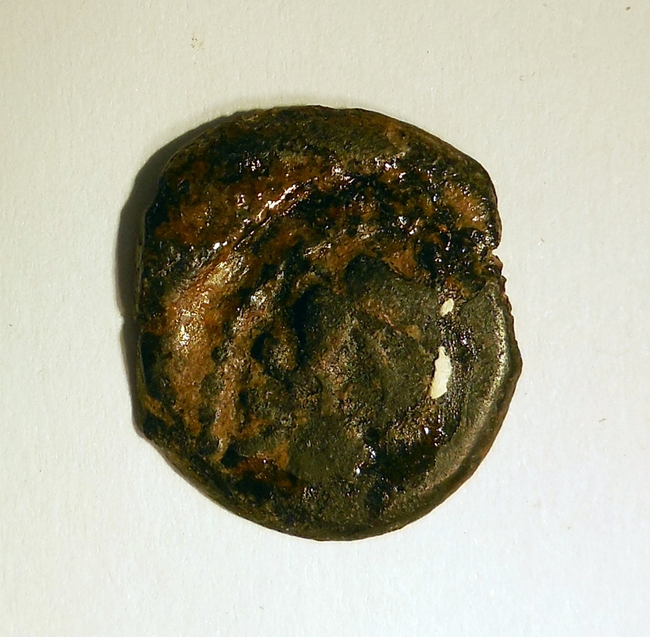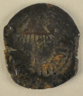 Munt geslagen tijdens regering van Herodes Agrippa (37-44 n.C.) met zonnescherm met franje, kz. drie korenaren met 'jaar 6'