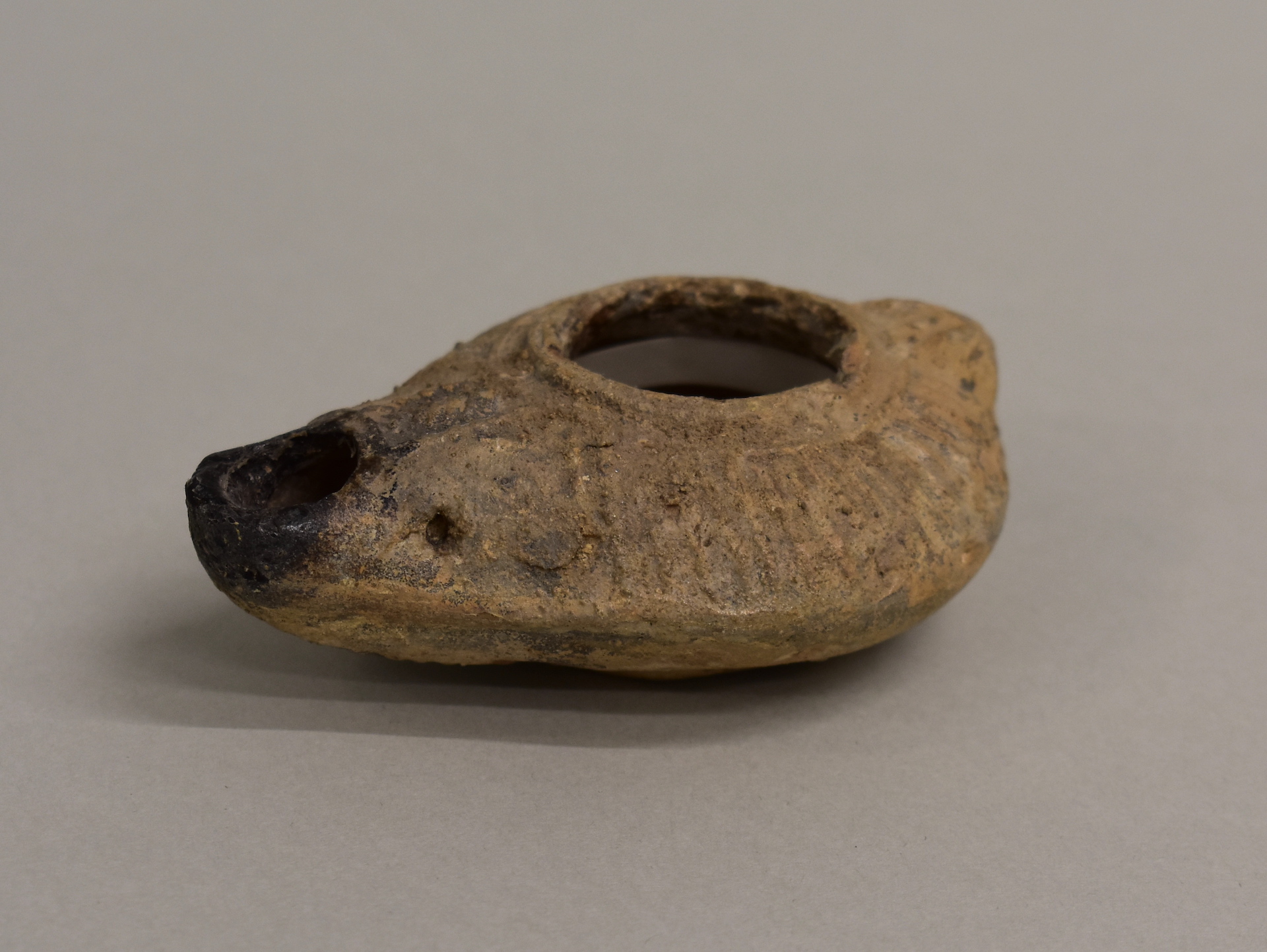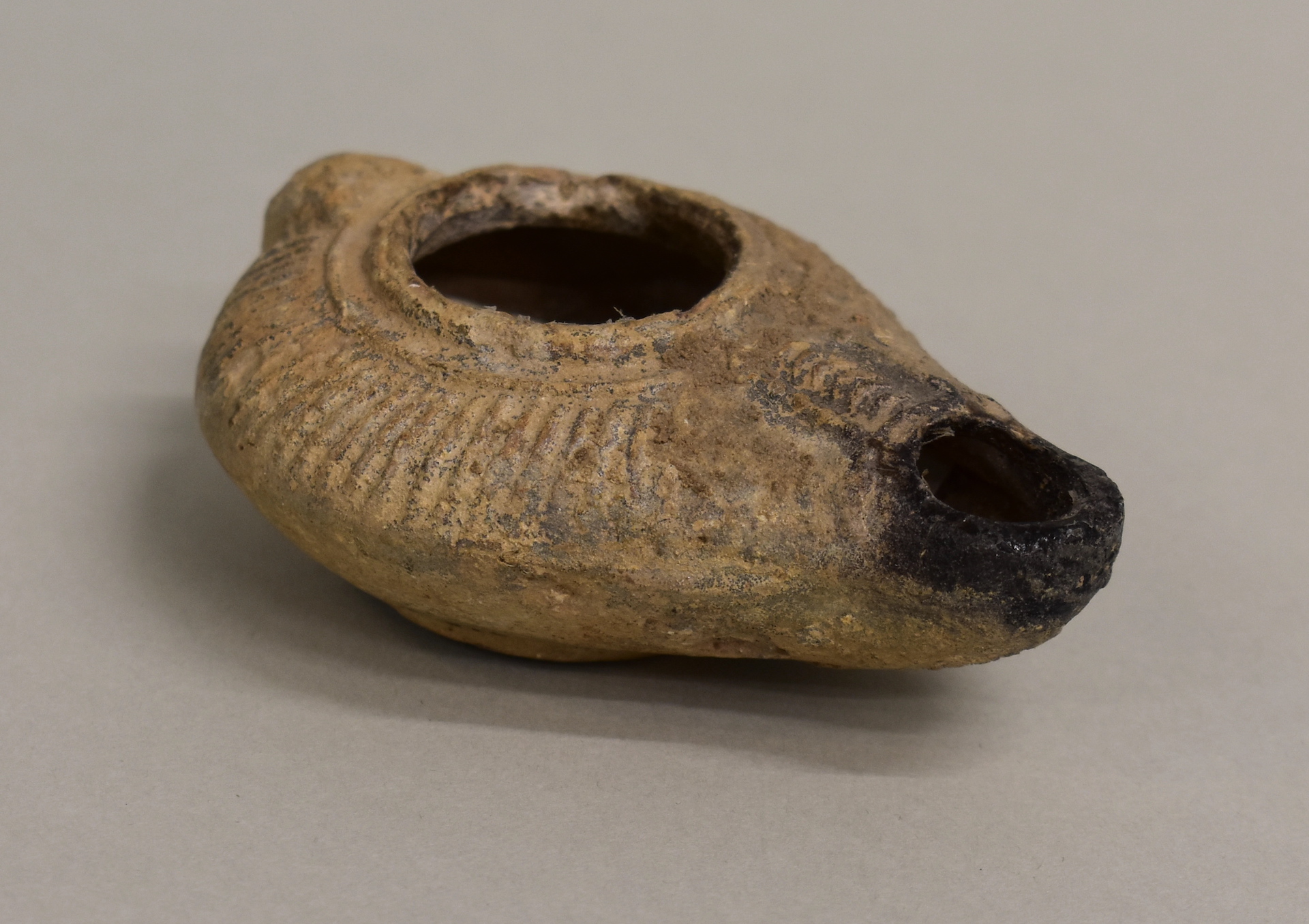 Olielampje uit het Kedrondal met streepjesmotief en 'aanzet' van een handgreep en zwart geblakerde tuit, aan de onderzijde in het voetstuk de vorm van een negen-spakig wiel, met stippen tussen de spaken