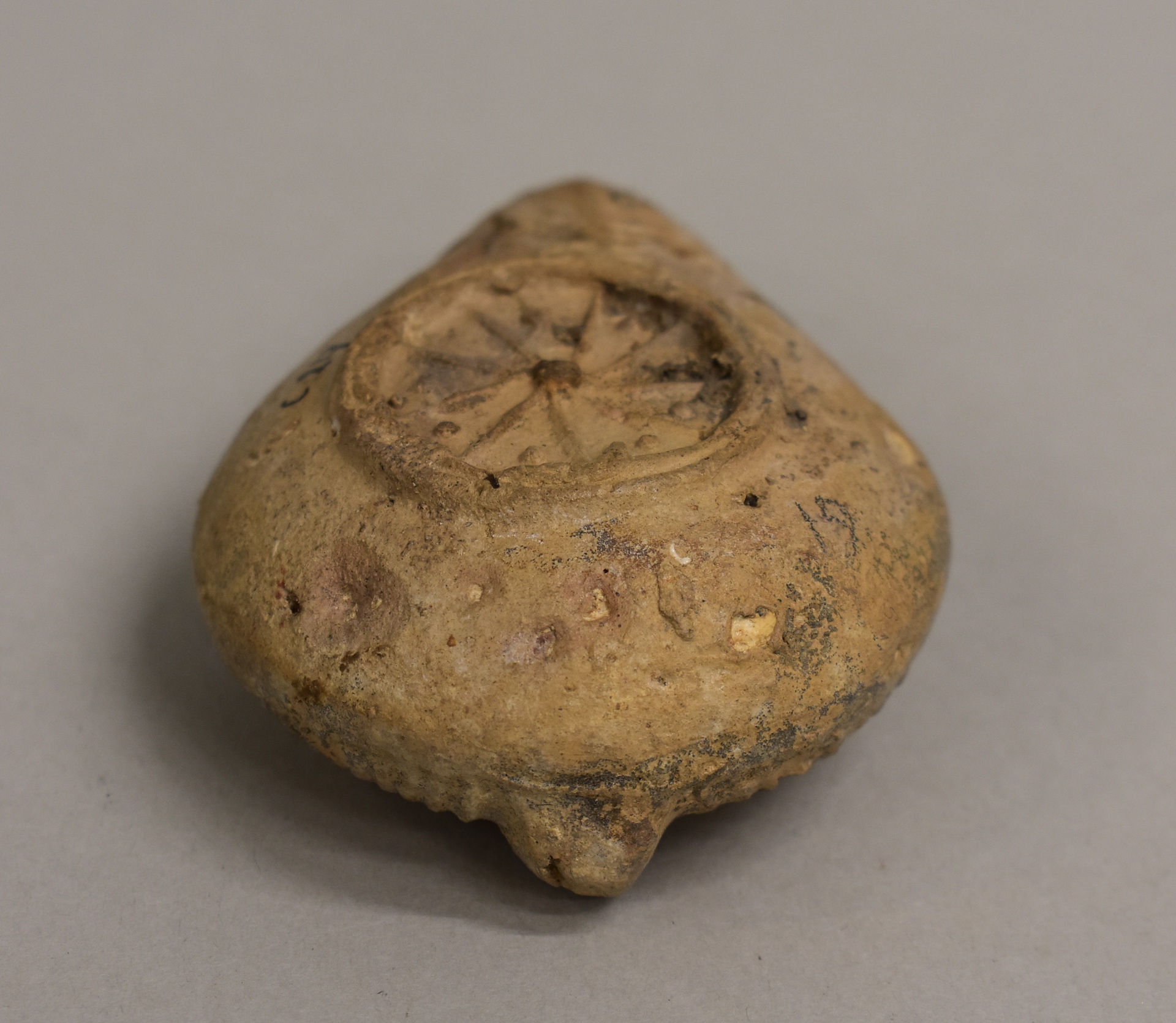 Olielampje uit graf in het Kedrondal met streepjesmotief, aan de onderzijde in het voetstuk de vorm van een negen-spakig wiel, met stippen tussen de spaken