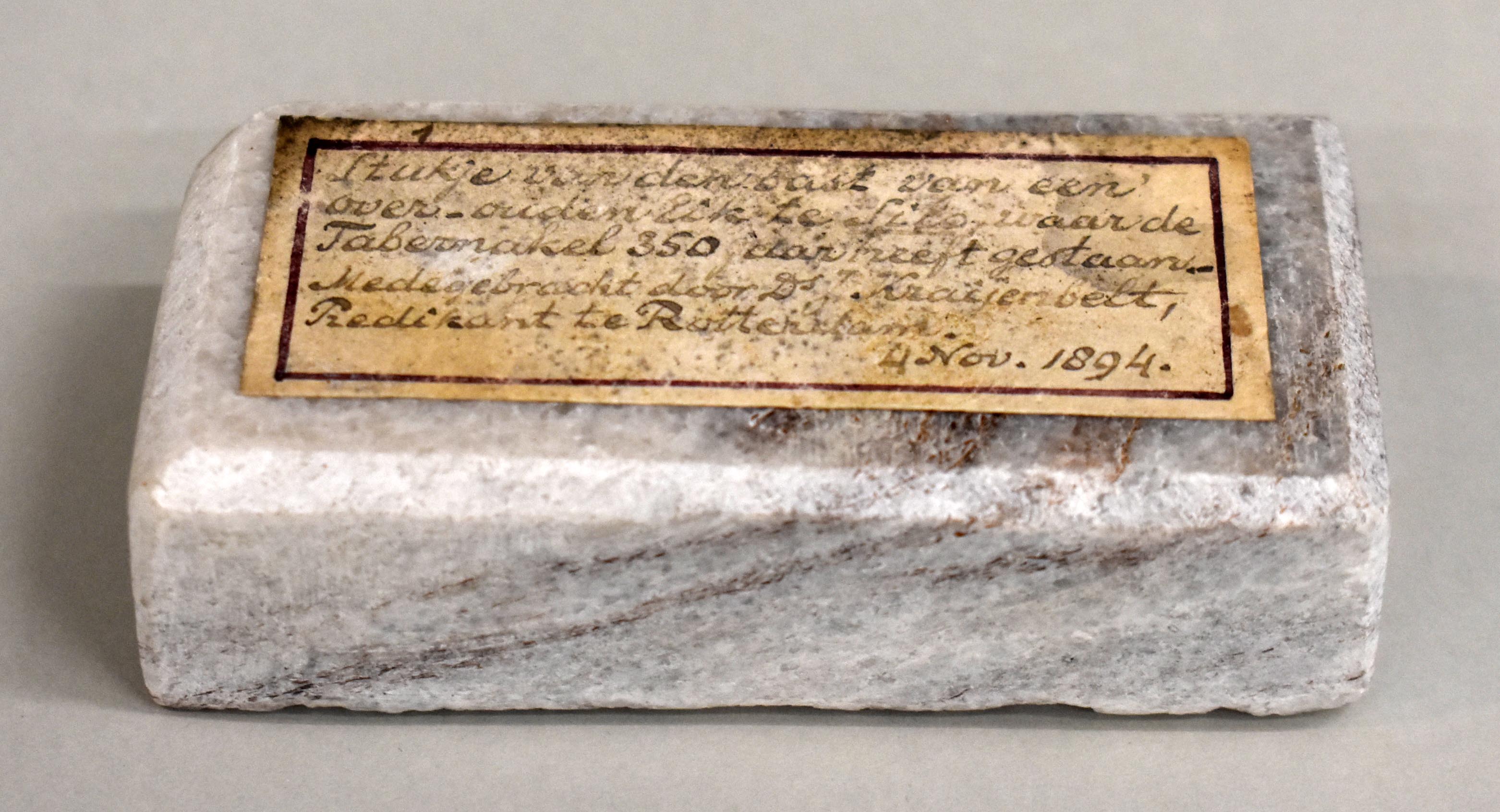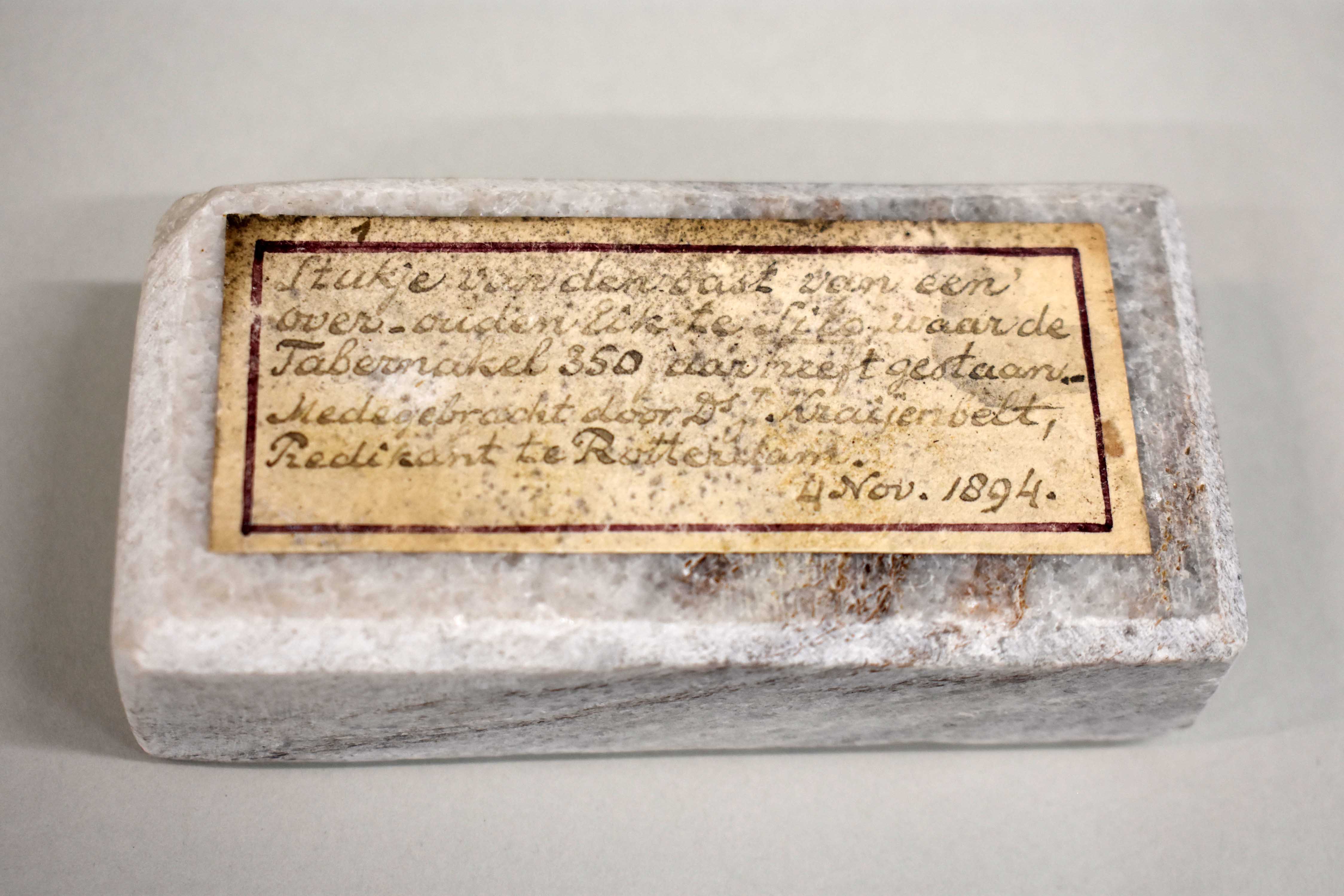 Marmeren sokkel met handgeschreven etiket, met "Stukje van den bast van een over-ouden eik te Silo, waar de Tabernakel 350 jaar heeft gestaan. Medegebracht door Ds. J. Kraijenbelt, Predikant te Rotterdam. 4 Nov. 1894"