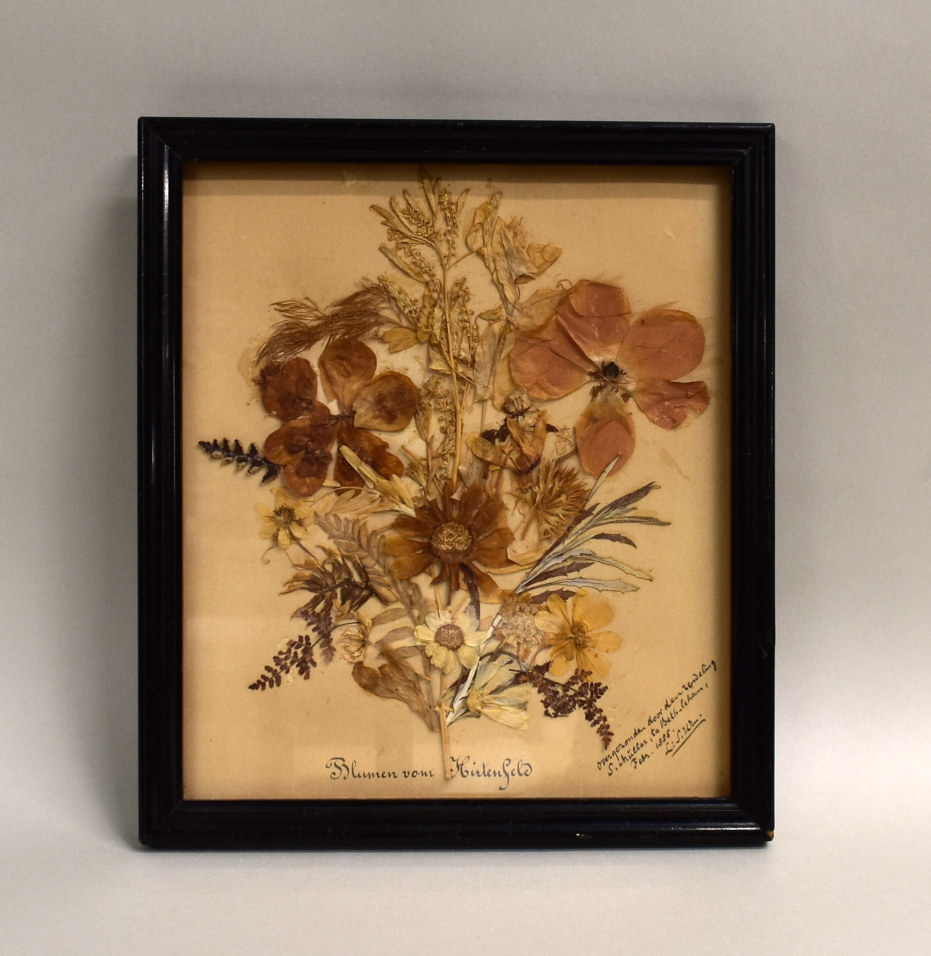 Droogbloemschilderijtje met "Blumen vom Hirtenfeld ..."