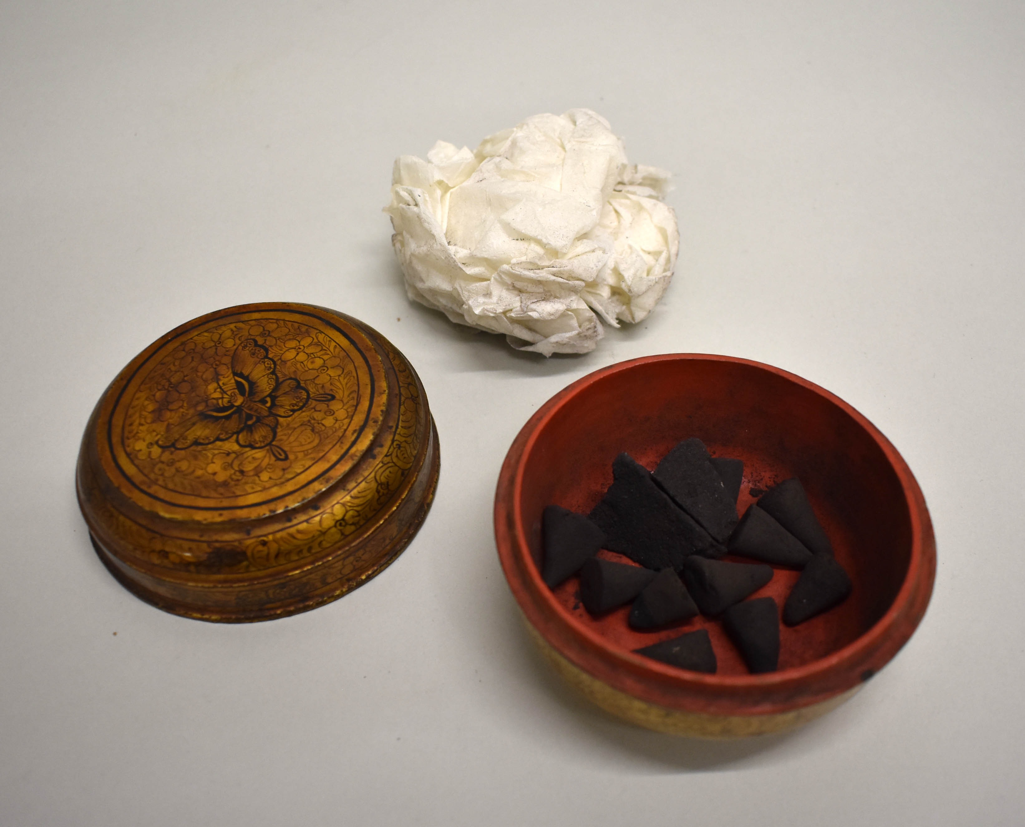Lakdoosje met vlinder en bloemmotieven met wierookkegels