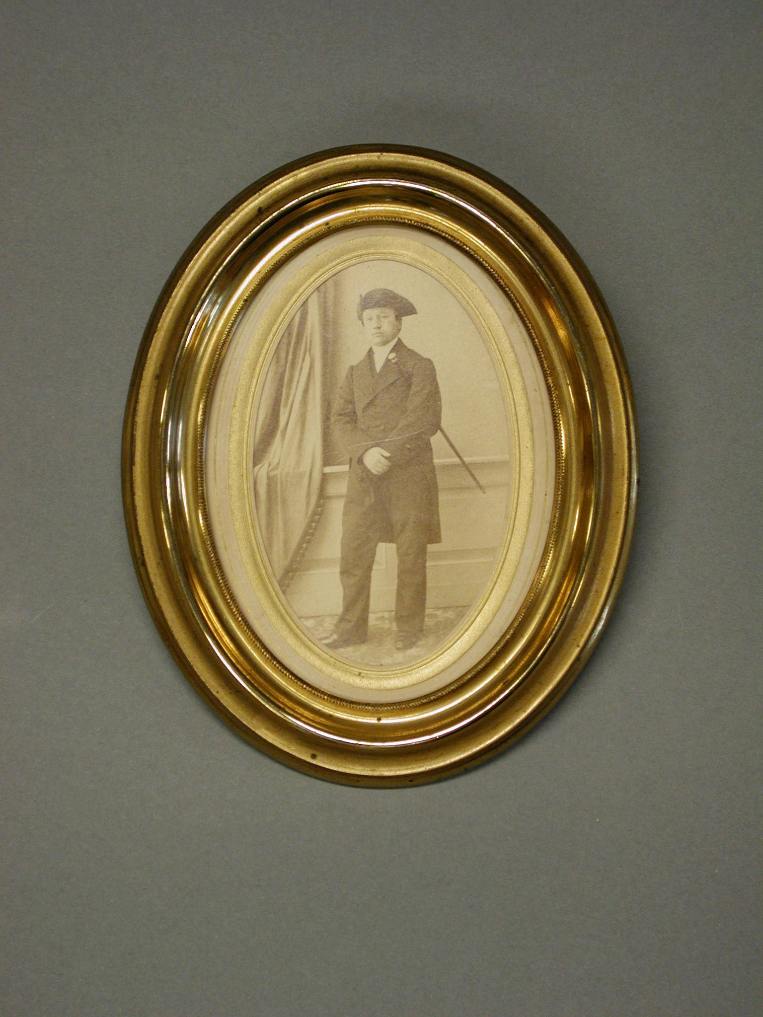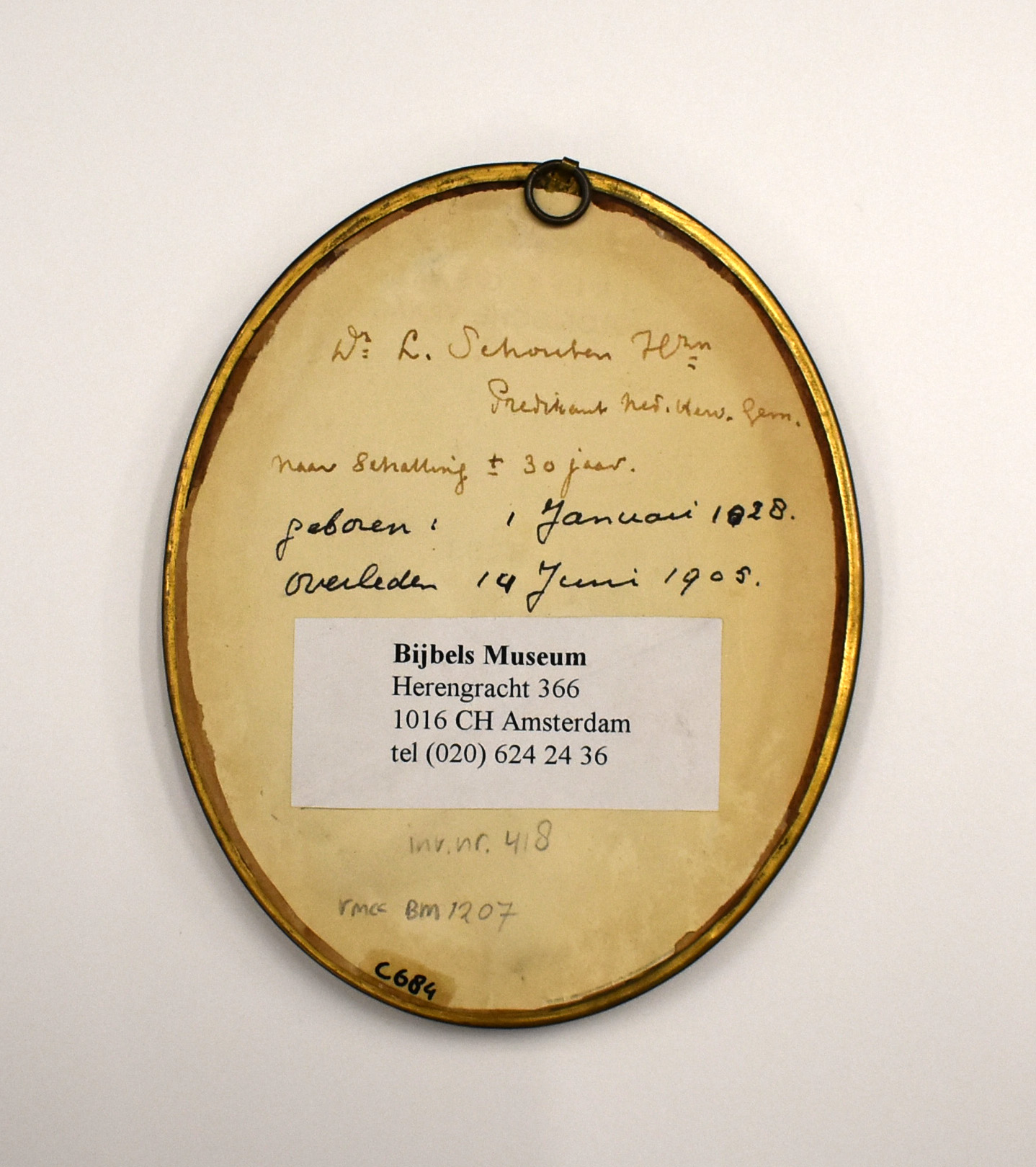Portretfoto ds. Leendert Schouten in traditionele predikantenkleding, in ovale goudkleurige lijst