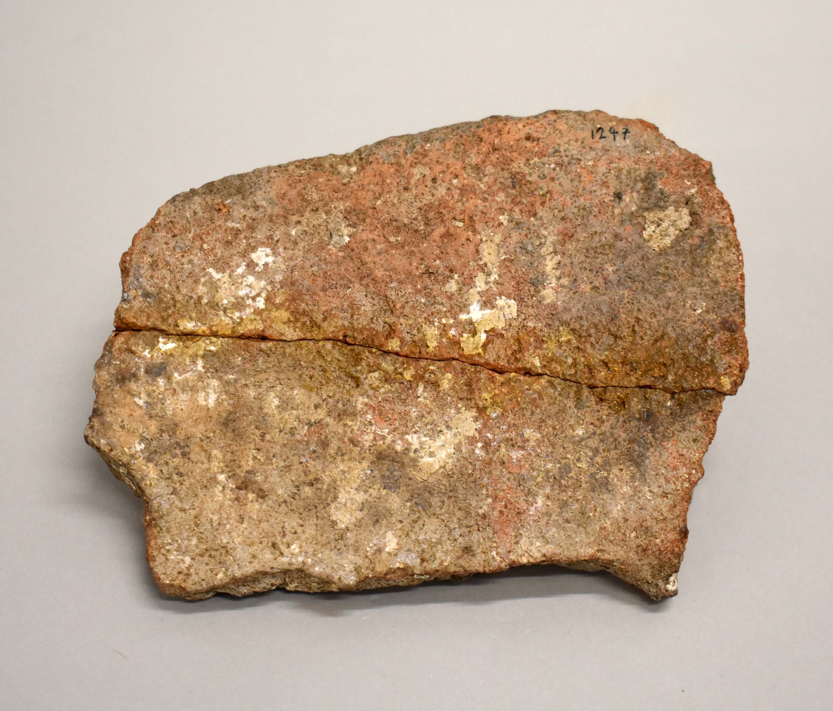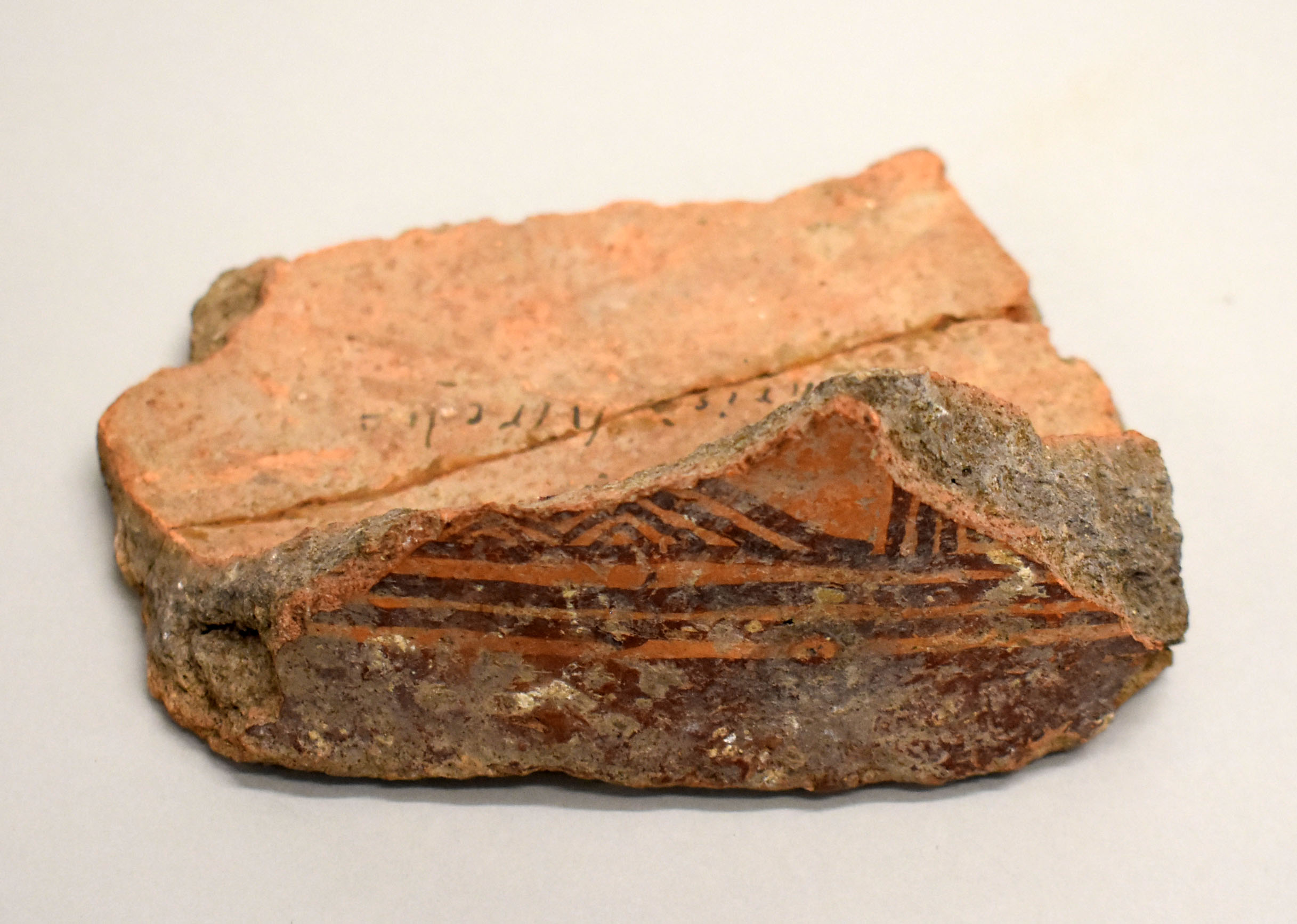 Stuk aardewerk met geometrisch patroon met "30 fuß ... Christ Kirch", gevonden bij de Christuskerk op de berg Sion in Jeruzalem