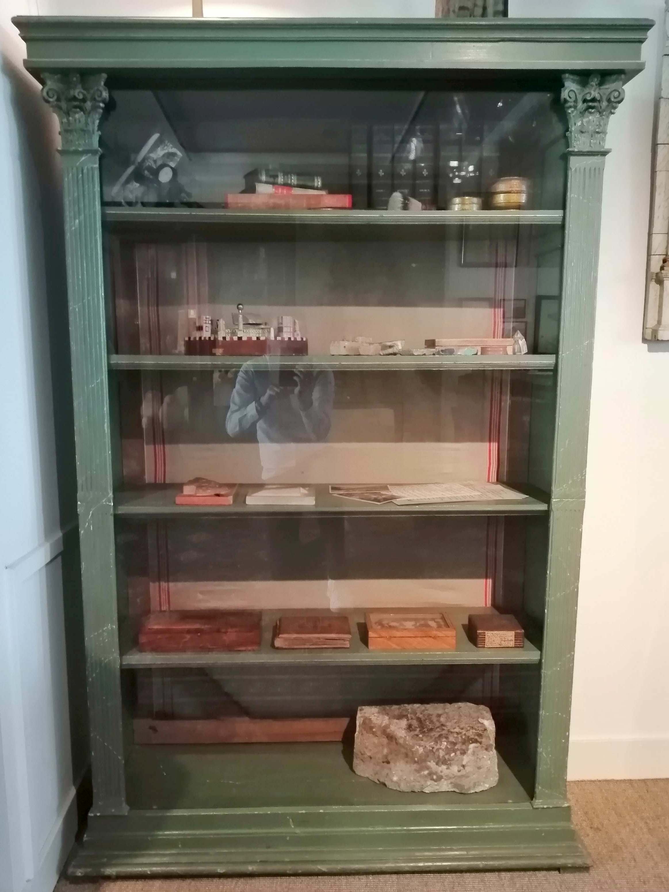 Groen geverfde boekenkast van ds. Leendert Schouten, gemaakt met onderdelen van 'Tempel van Salomo model Mill', gebruikt als vitrine in Bijbels Museum Amsterdam