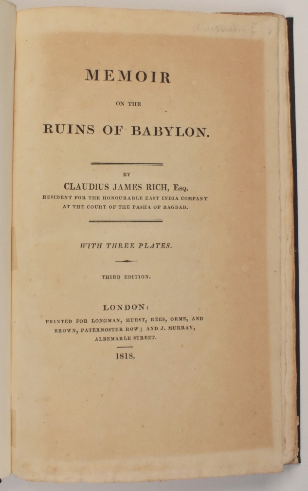Memoir on the ruins of Babylon. By Claudius James Rich, Esq. resident for the honourable East India Company at the court of the pasha of Bagdad with three plates. Third edition.; Second memoir on Babylon: containing an inquiry into the correspondence between the ancient descriptions of Babylon and the remains still visible on the site. ...