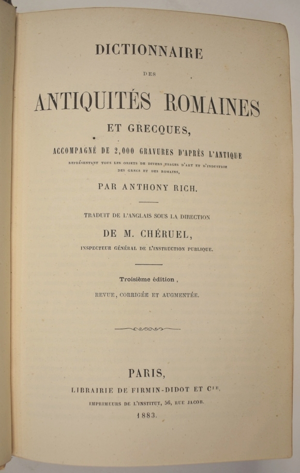 Dictionnaire des antiquités romaines et grecques : accompagné de 2000 gravures d'après l'antique : représentant tous les objets de divers usages d'art et d'industrie des grecs et des romains, par Anthony Rich. Traduit de l'Anglais sous la direction de M. Chéruel, inspecteur Général de l'instruction publique. Troisième édition, revue, corrigée et augmentée.
