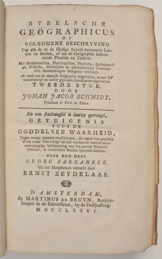 Bybelsche geögraphicus of Volkomene beschryving van alle de in de Heilige Schrift benoemde landen en steden, of tot de geögraphie behoorende plaatsen en zaaken. Met mathematische, phylologische, physische, zedenkundige, politieke historische en geheimzinnige theölogische aanmerkingen doorgaans voorzien. Als mede met de nieuwste Geögraphie vergeleeken, en met XV naauwkeurige en zuiver gesneeden Landkaarten opgehelderd. Tweede stuk. ...