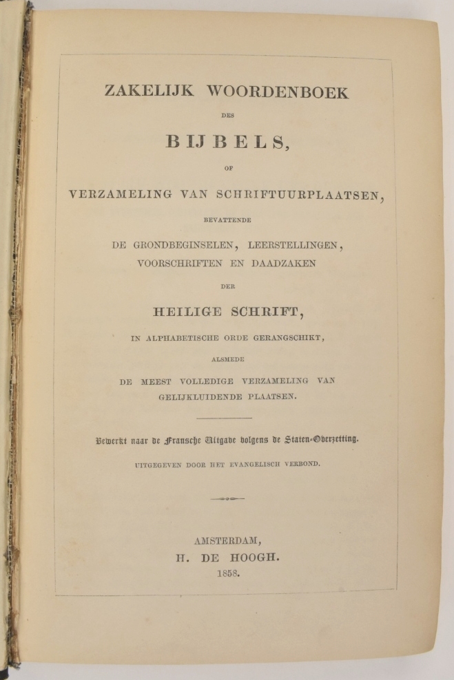 Zakelijk woordenboek des bijbels, of verzameling van schriftuurplaatsen, bevattende de grondbeginselen, leerstellingen, voorschriften en daadzaken der heilige schrift, in alphabetische orde gerangschrikt, alsmede de meest volledige verzameling van gelijkluidende plaatsen. Bewerkt naar de Fransche Uitgave volgens de Staten-Overzetting.
