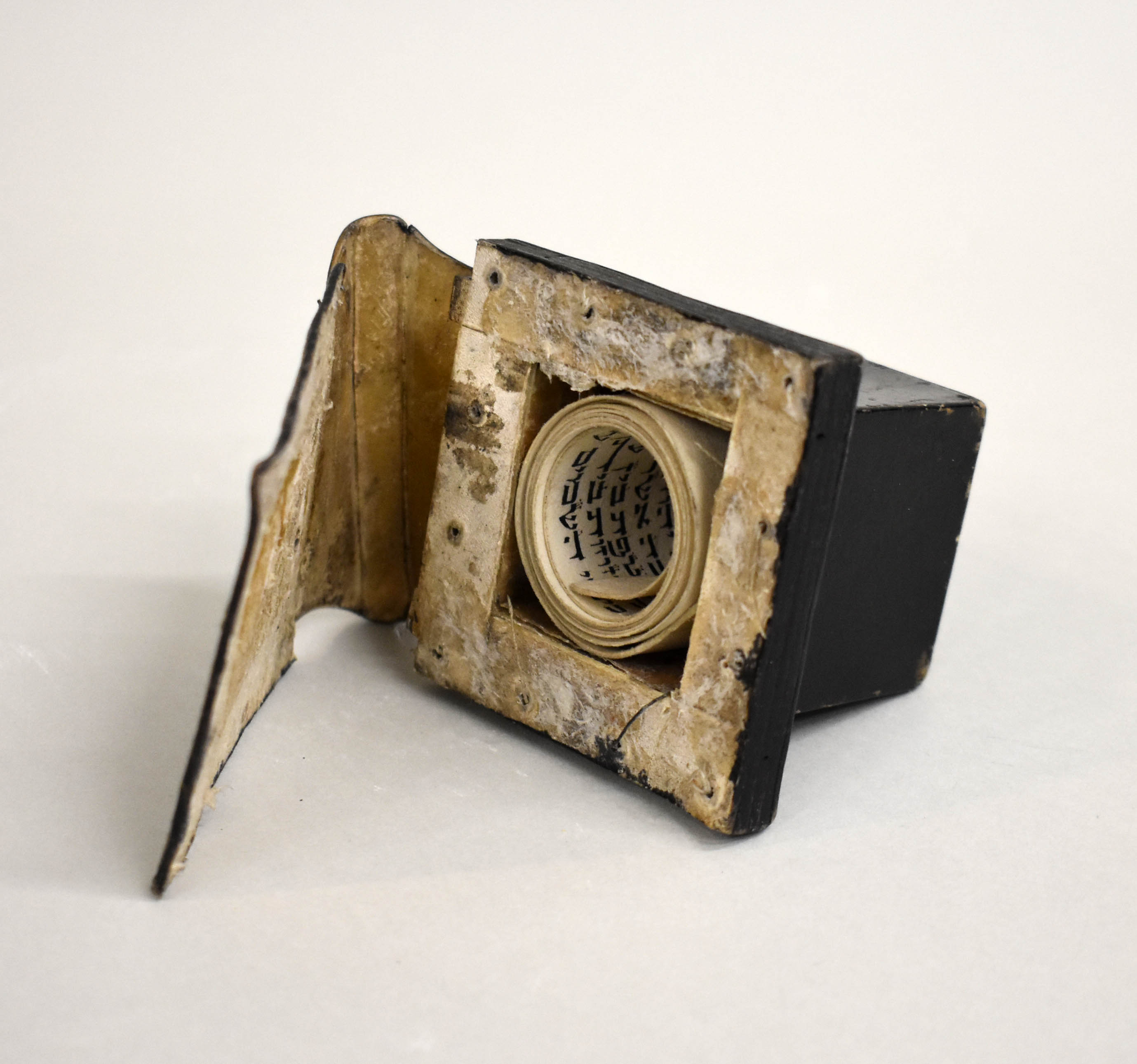 Tefillien voor de linkerbovenarm (van buitengewone grootte) met perkamentrol