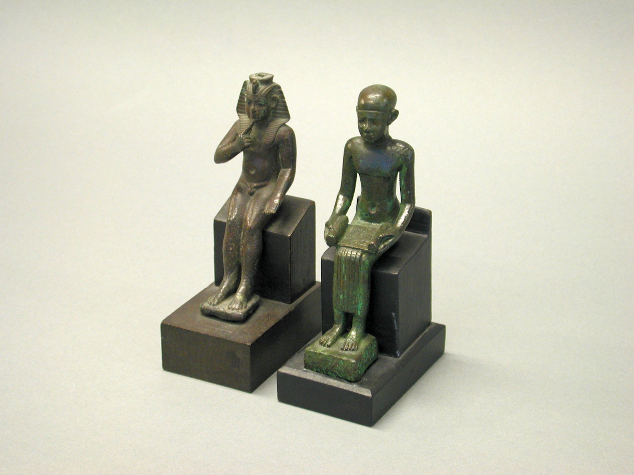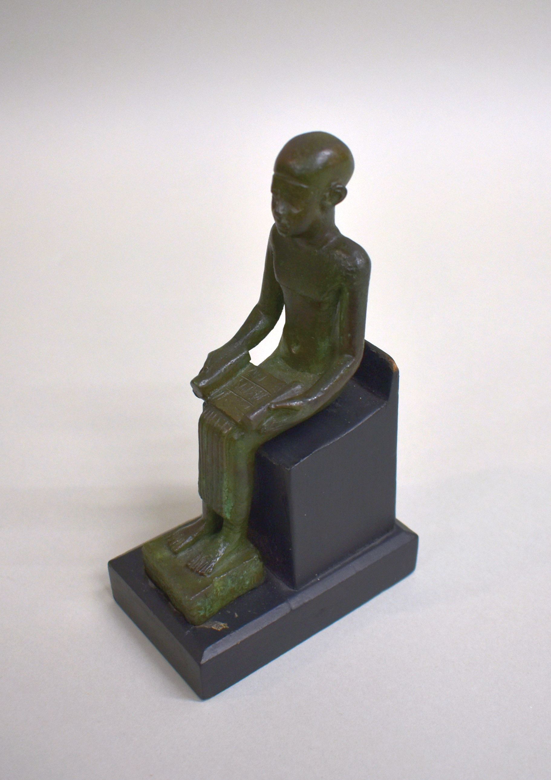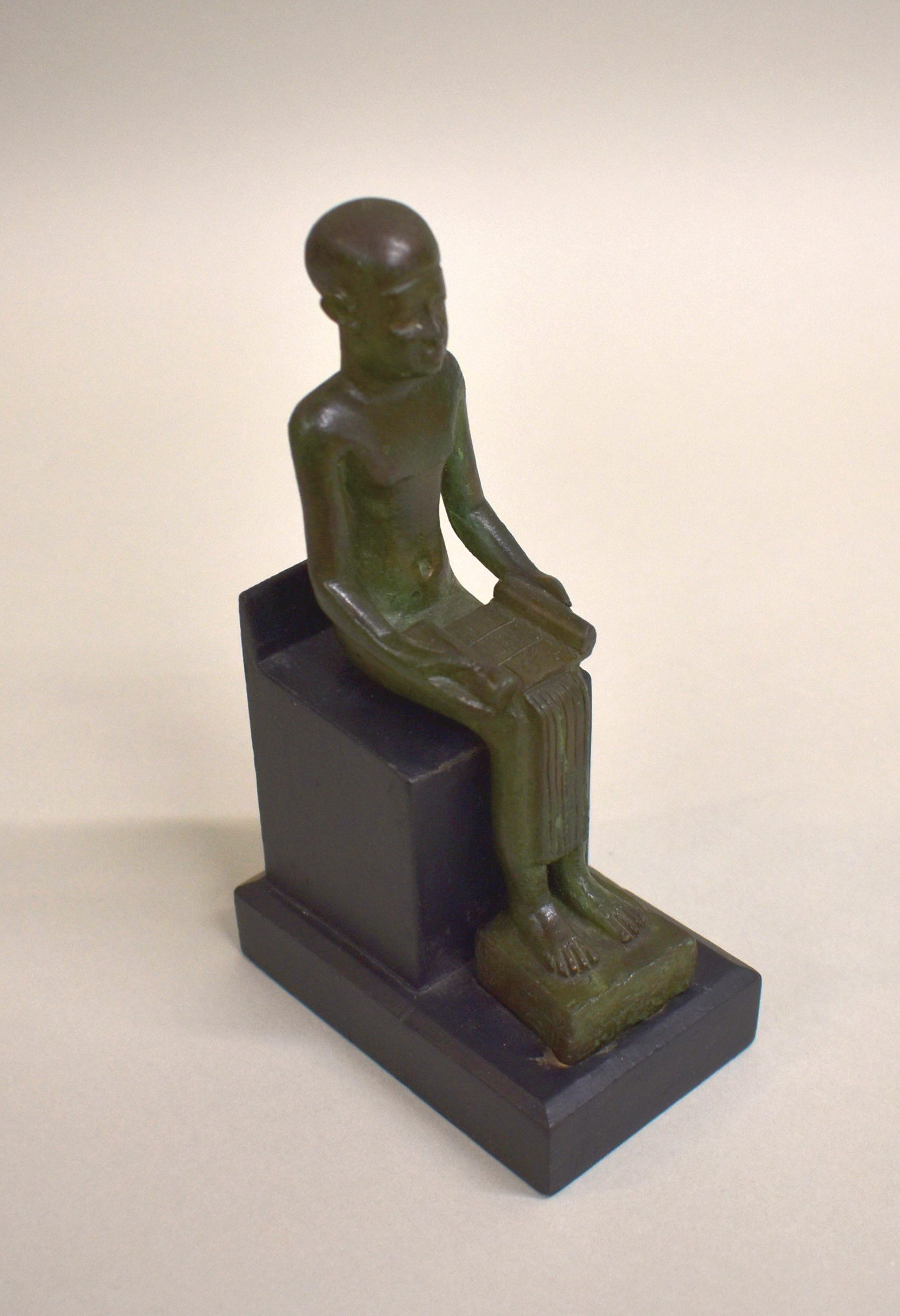 Zittende figuur met boekrol geopend op de schoot. Het bovenlijf is ontbloot evenals de voeten. De benen zijn bedekt met een geplooide rok en het hoofd met een glad hoofddeksel.