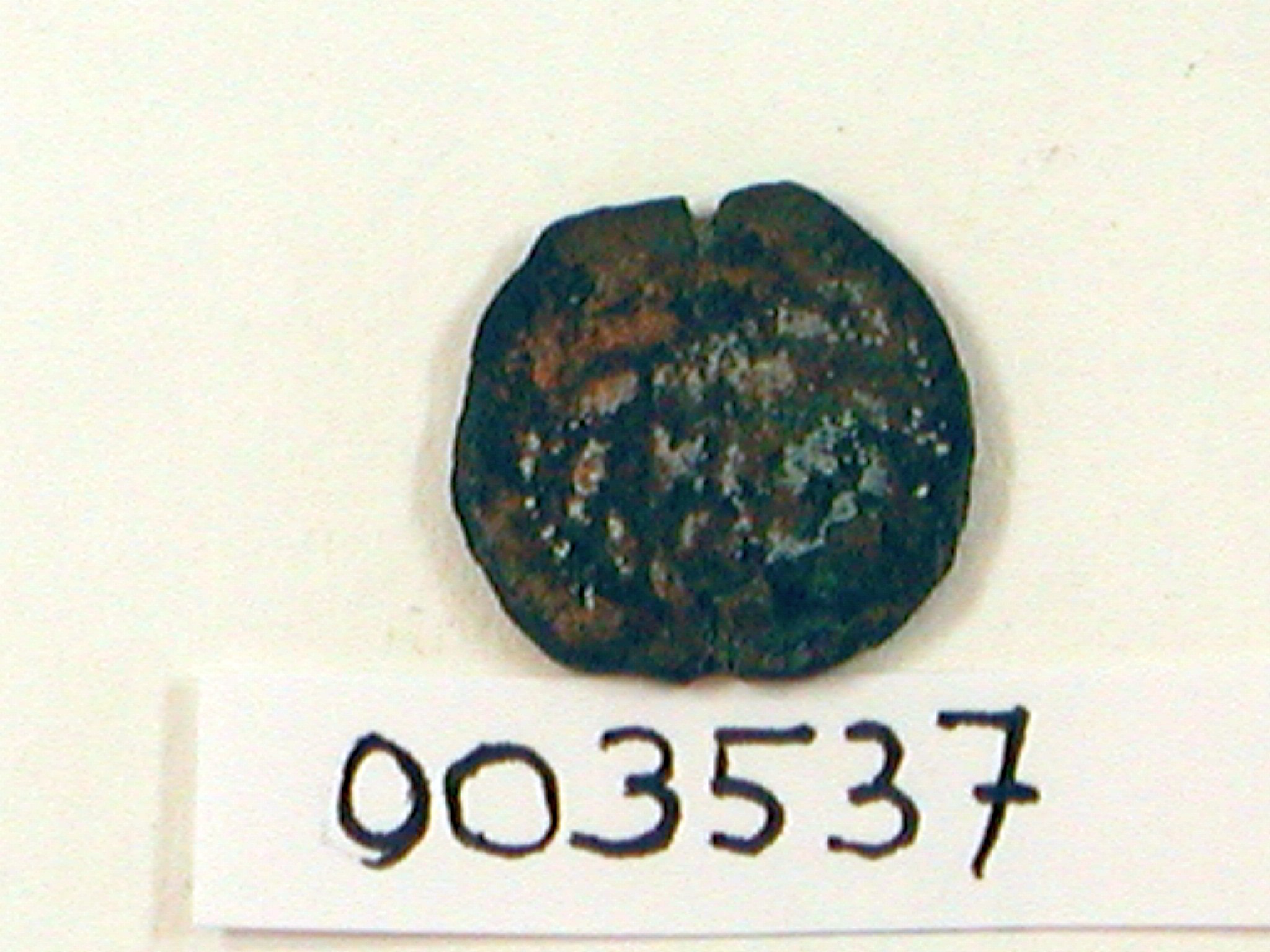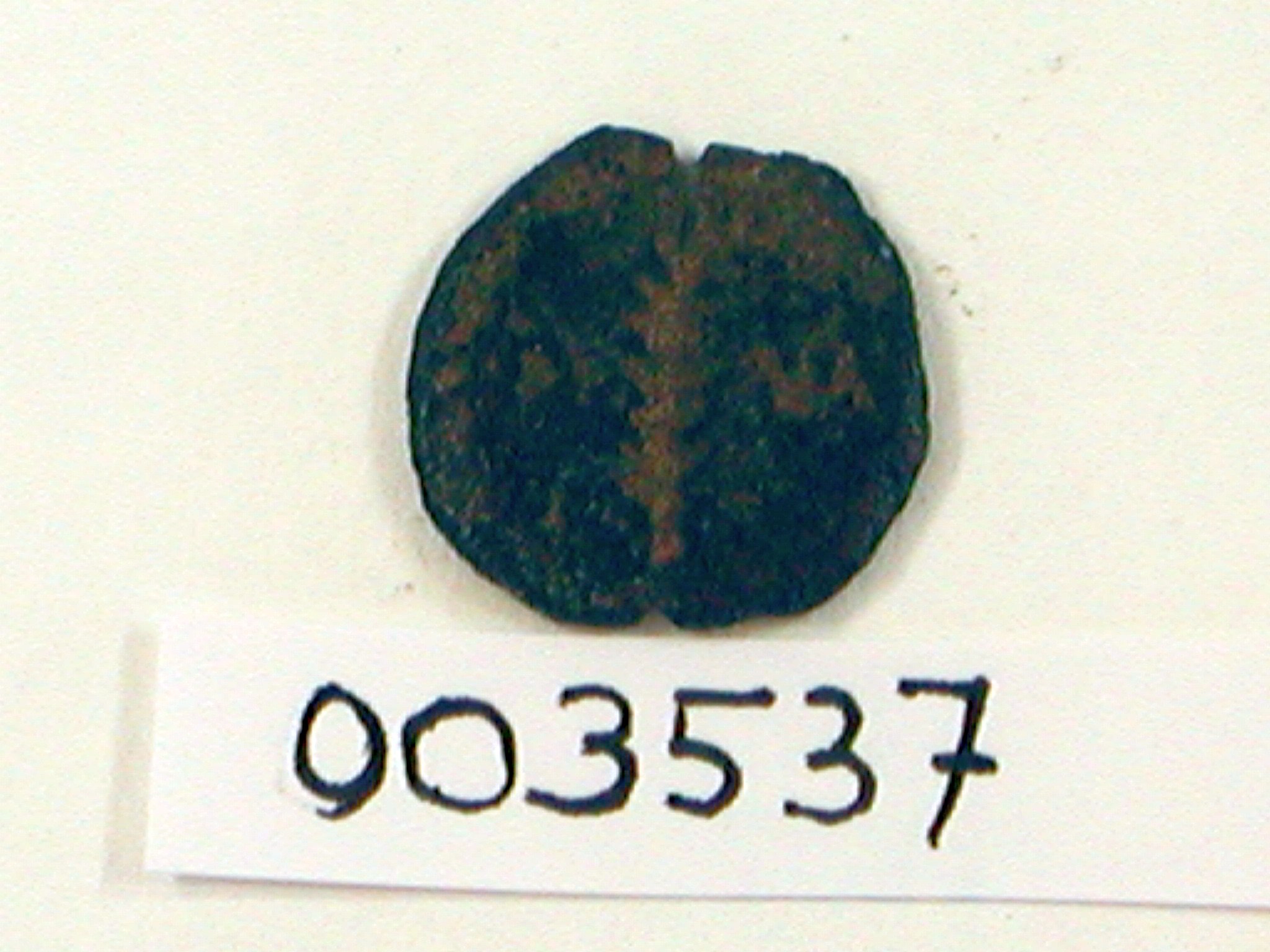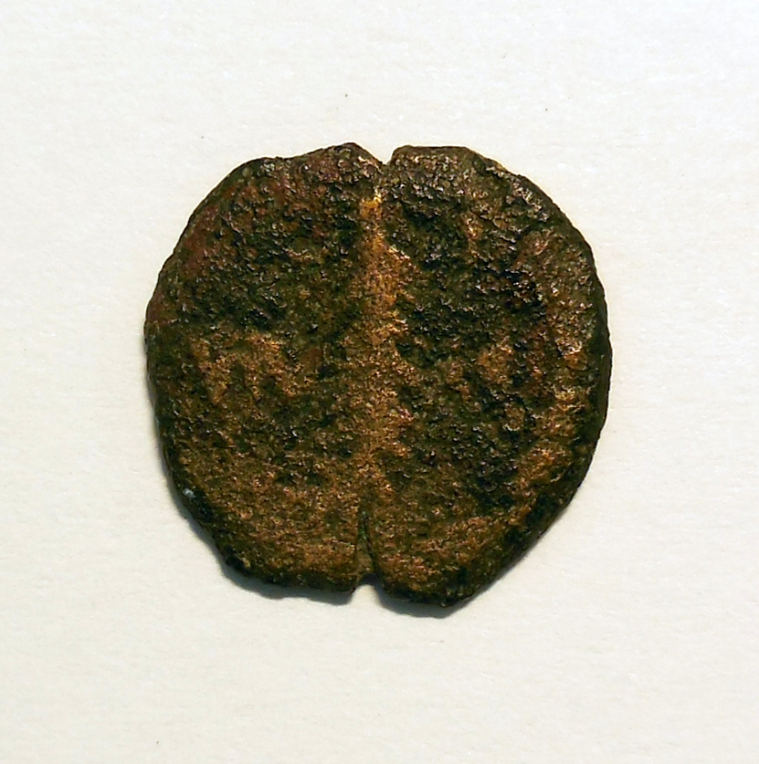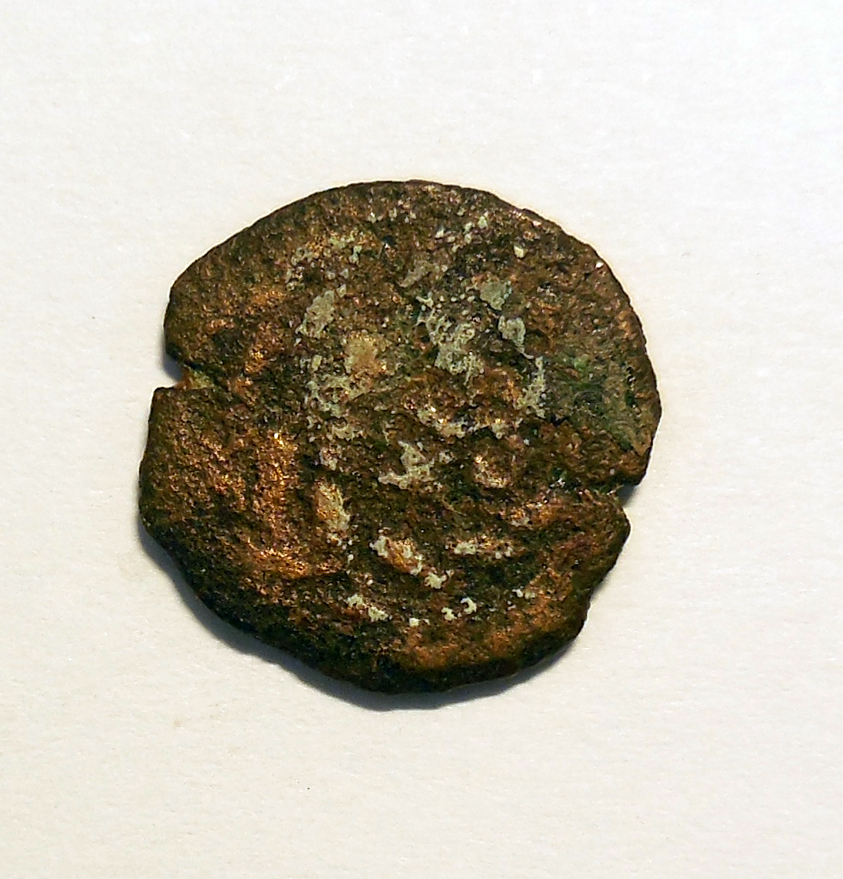 Munt Valerius Gratus met krans met tekst 'van Tiberius caesar' (onleesbaar geworden door lijmresten), kz. gebogen palmtak met tekst 'Julia, jaar 11' (is 24 na Chr.)