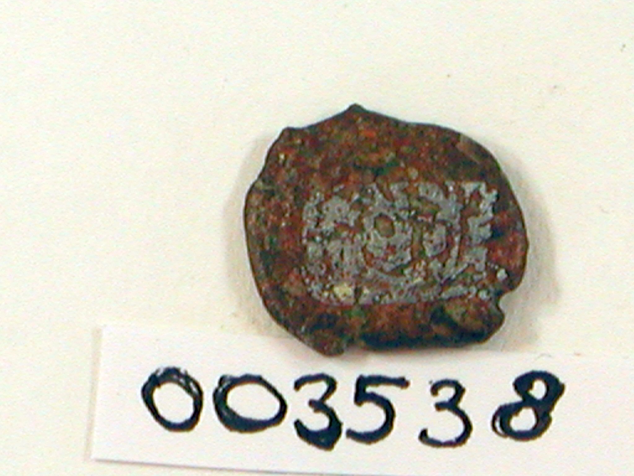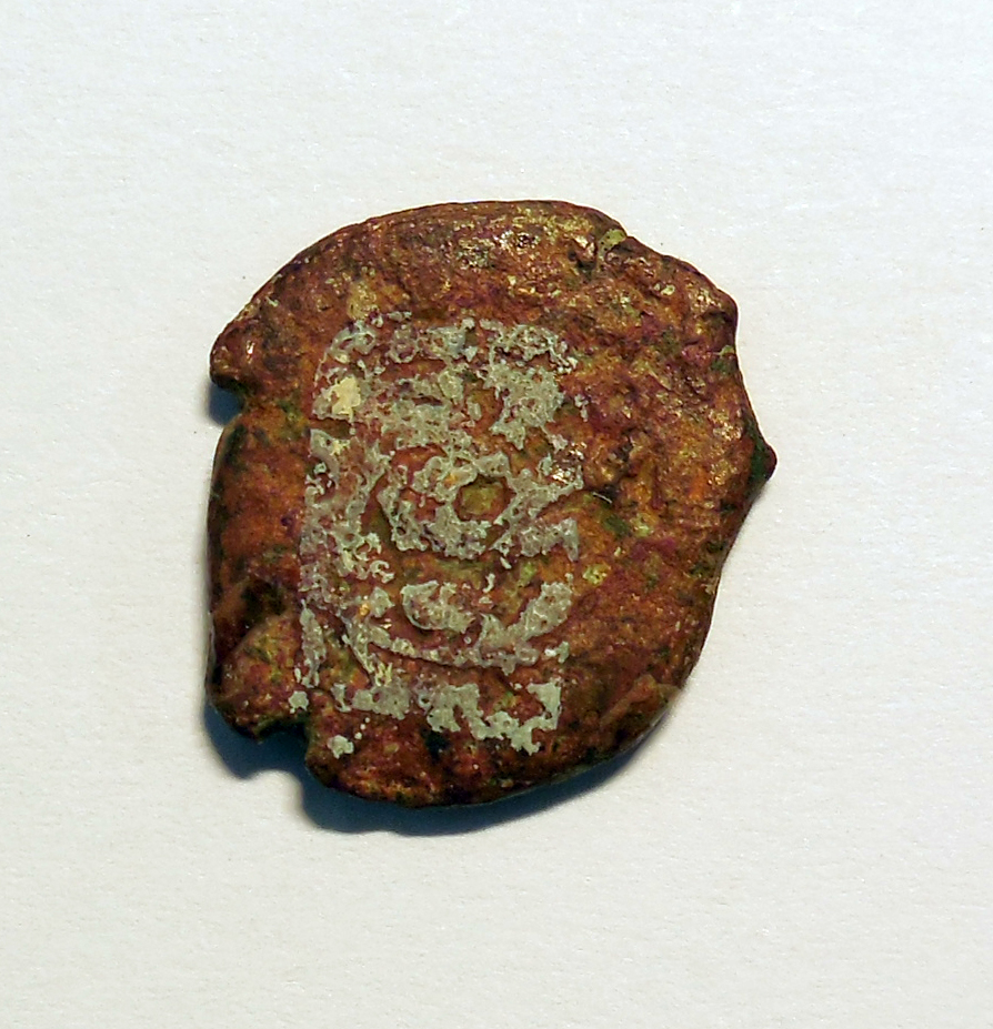 Munt Antonius Felix met twee kruislings geplaatste palmtakken, met tussen de stelen 'jaar 14' (is 54 na Chr.) en 'van Titus Claudius Caesar Germanicus', kz. krans met tekst 'Julia Agrippina' (deels onleesbaar geworden door lijmresten)
