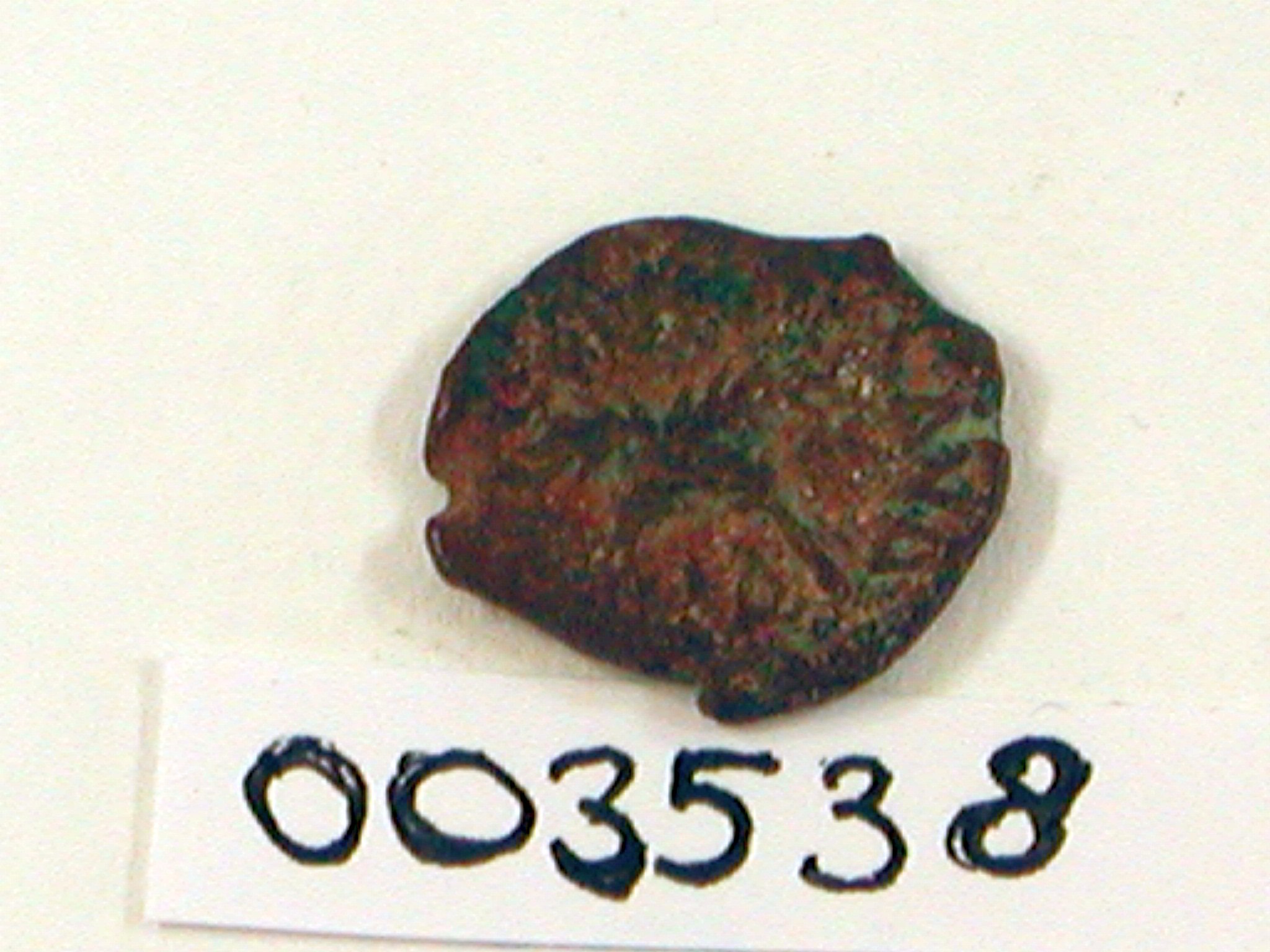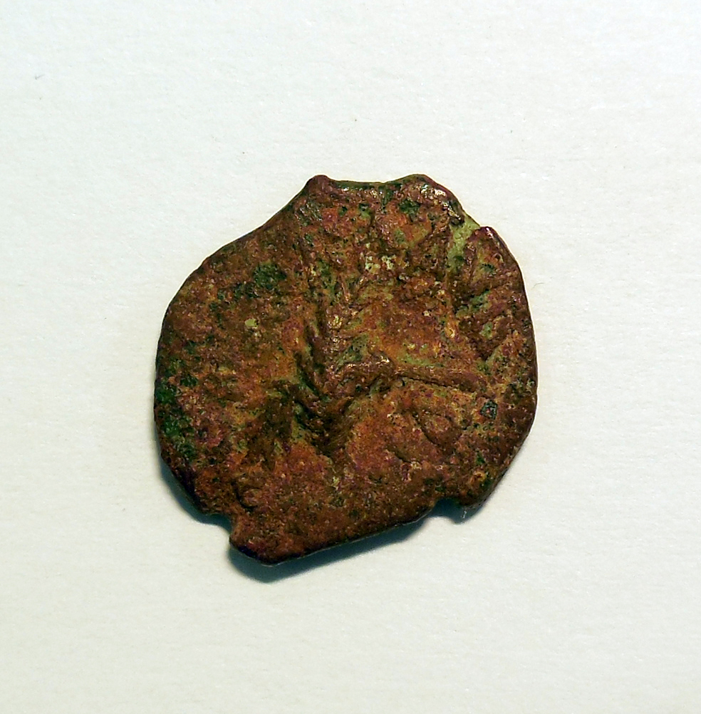 Munt van Antonius Felix met twee kruislings geplaatste palmtakken, met tussen de stelen 'jaar 14' en 'van Titus Claudius Caesar Germanicus', kz. krans met tekst 'Julia Agrippina' (deels onleesbaar geworden door lijmresten)
