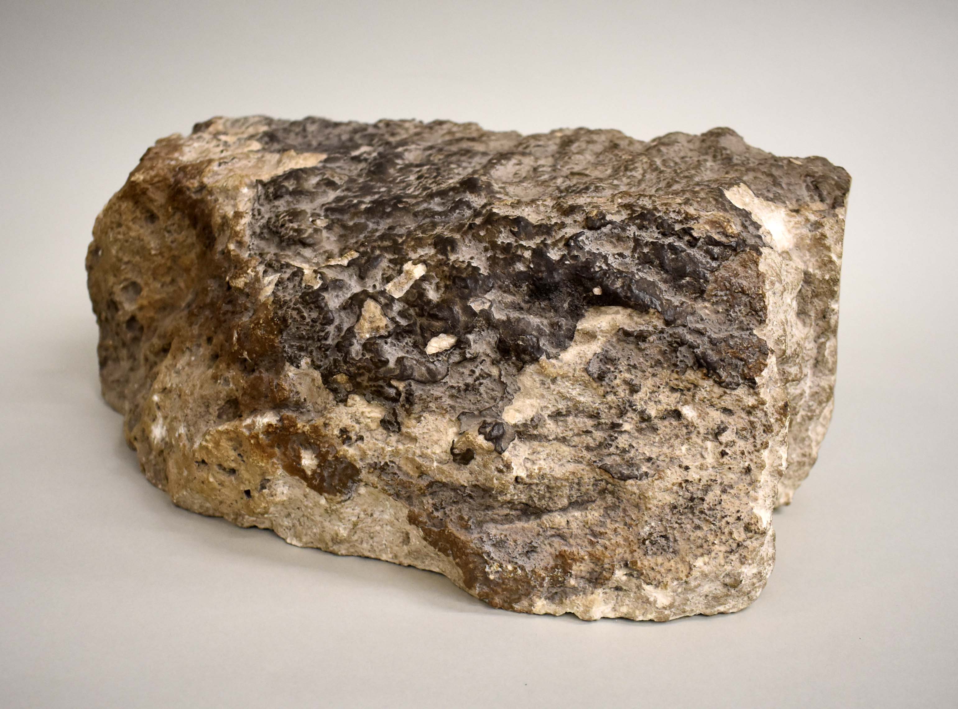 Harde kalksteen, grijs-wit, dat aan drie zijden is afgezaagd van een groter stuk, dat met een aardbeving was losgeraakt.