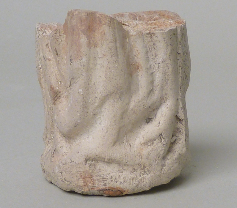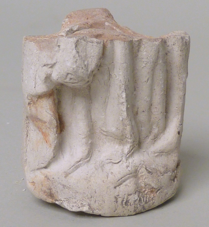 Pijpaarde fragment uit verdronken land van Zuid-Beveland: heiligenbeeld met gewaad