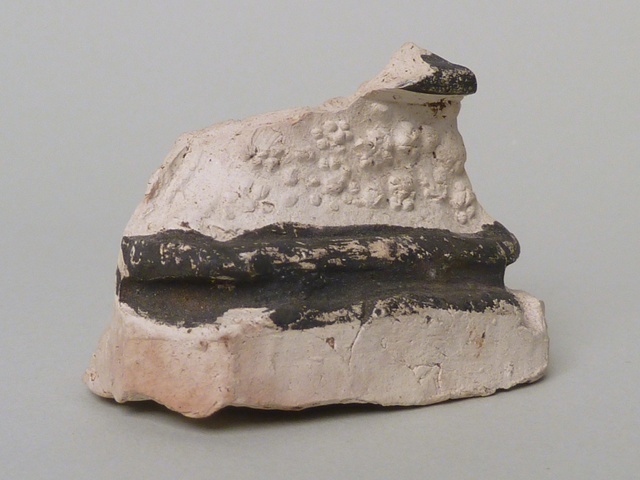 Pijpaarde fragment uit verdronken land van Zuid-Beveland: geprofileerde sokkel met florale motieven en zwarte verf