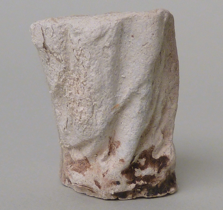 Pijpaarde fragment uit verdronken land van Zuid-Beveland: heiligenbeeld met gewaad