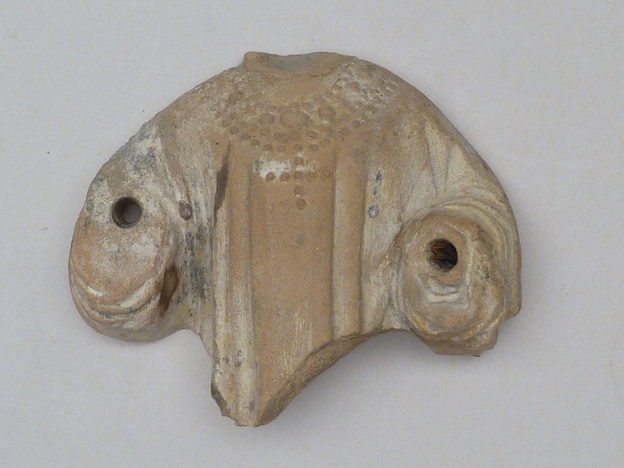 Terracotta fragment uit verdronken land van Zuid-Beveland: bovenlijf met gewaad en rozenkrans met kruis, met aanzetgaten voor losse handen