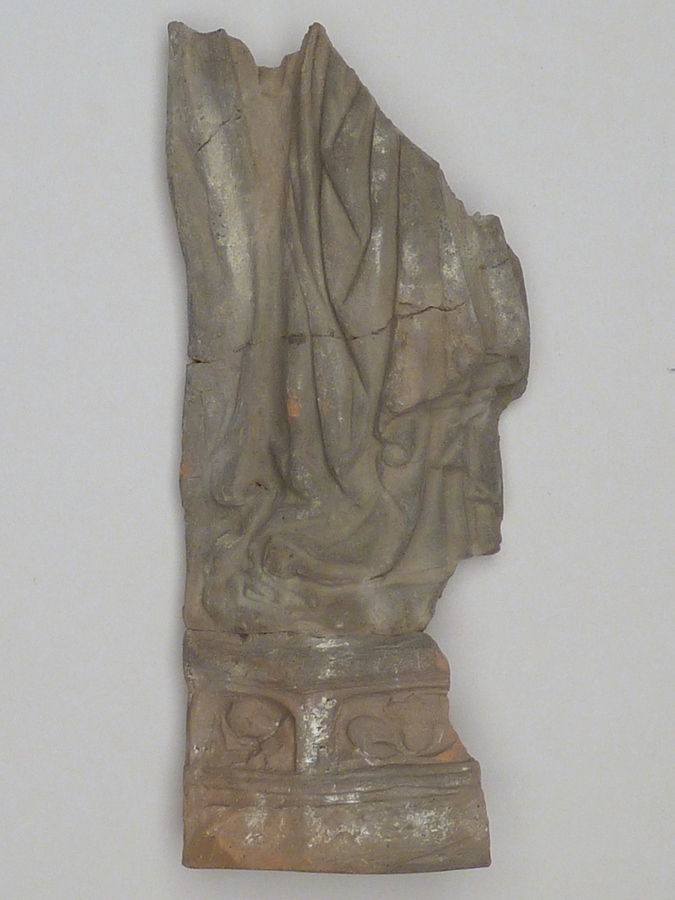 Terracotta fragment uit verdronken land van Zuid-Beveland: heiligenbeeld op sokkel met bogenfries