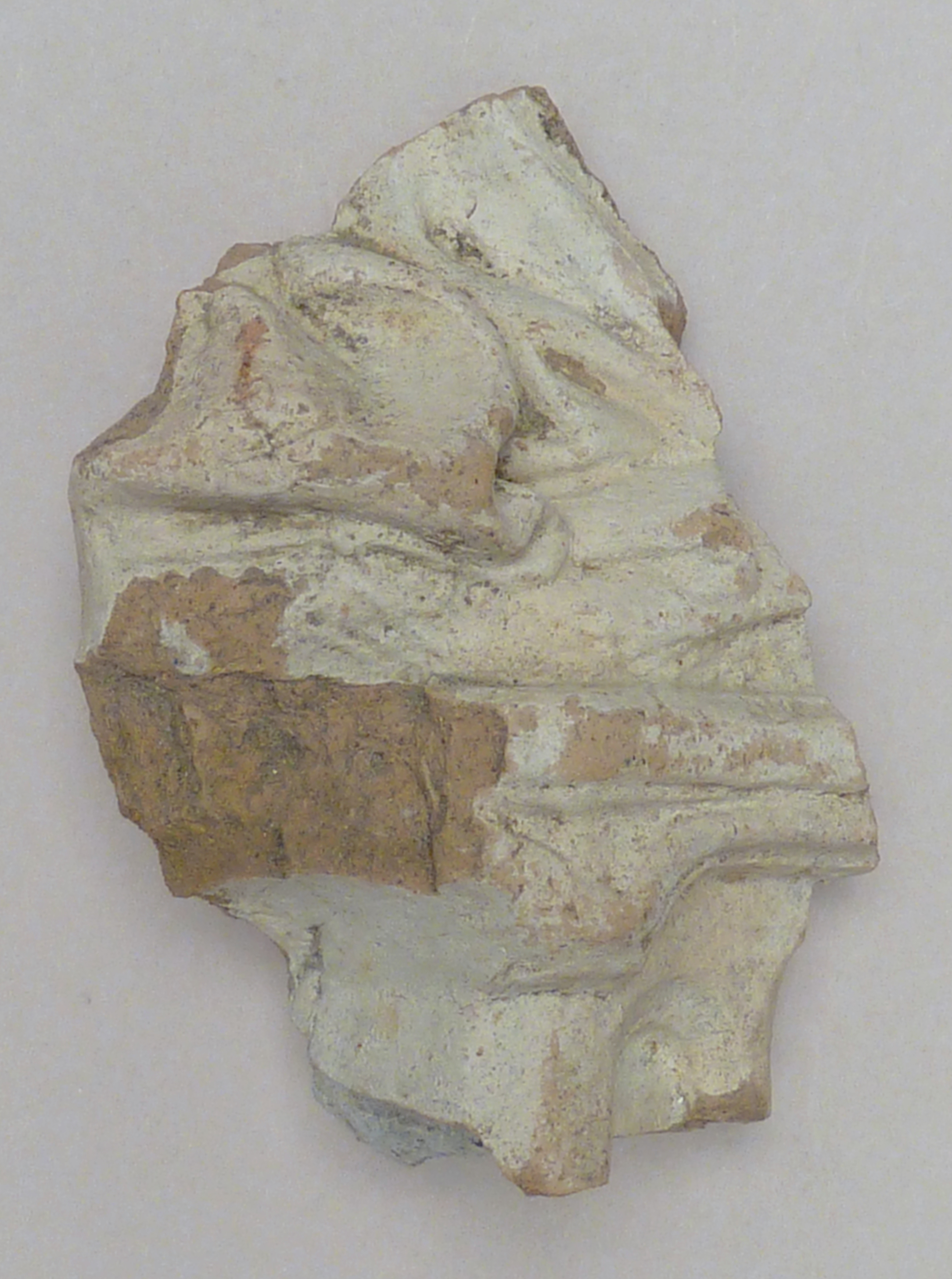Terracotta fragment uit verdronken land van Zuid-Beveland: sokkel met bogenfries, van heiligenbeeld