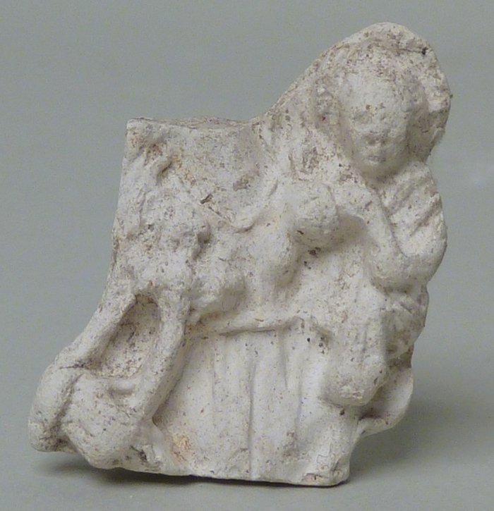 Pijpaarde fragment uit verdronken land van Zuid-Beveland: bovenlijf van Maria met kind op de linkerarm