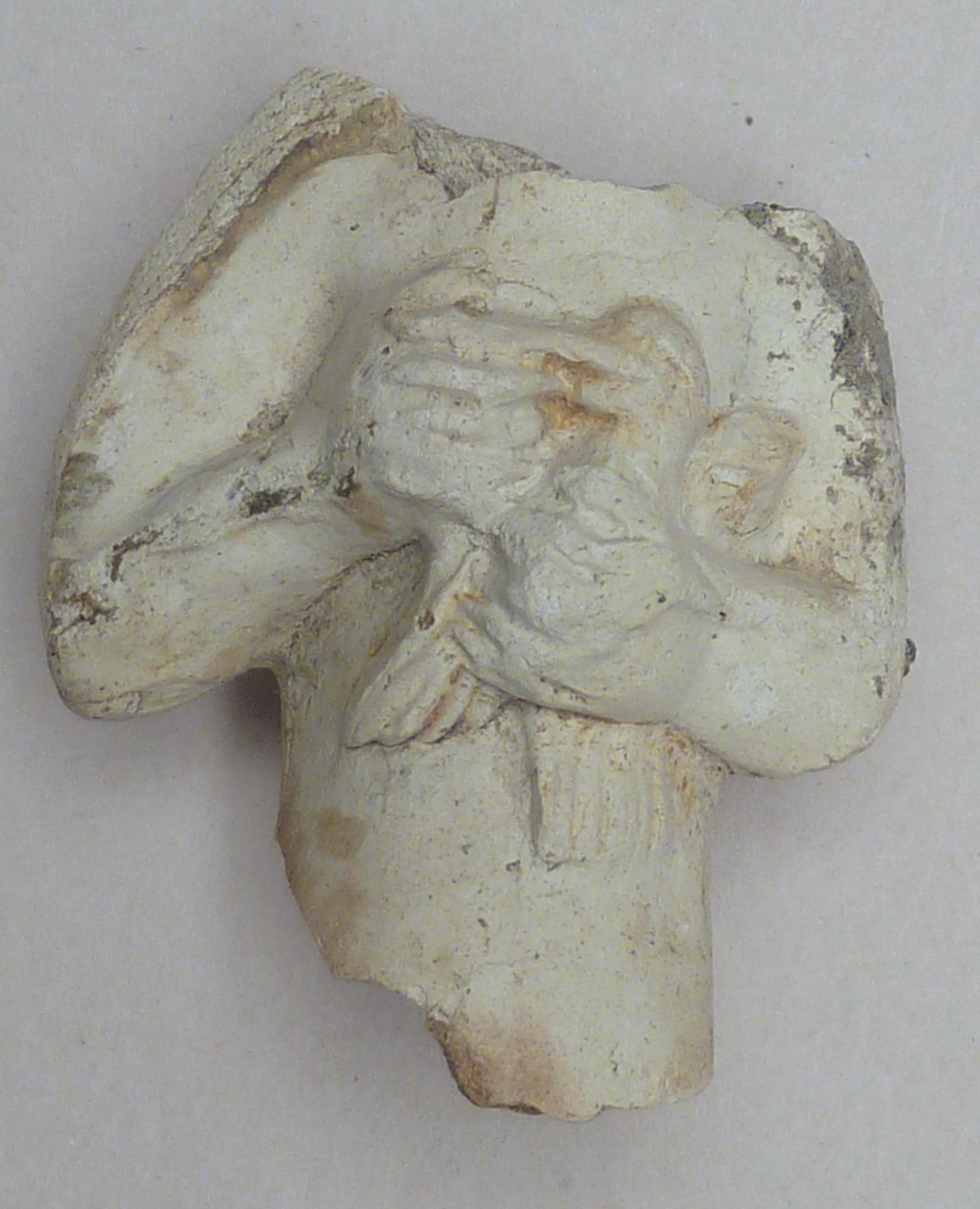 Pijpaarde fragment uit verdronken land van Zuid-Beveland: staand Christuskind met duif